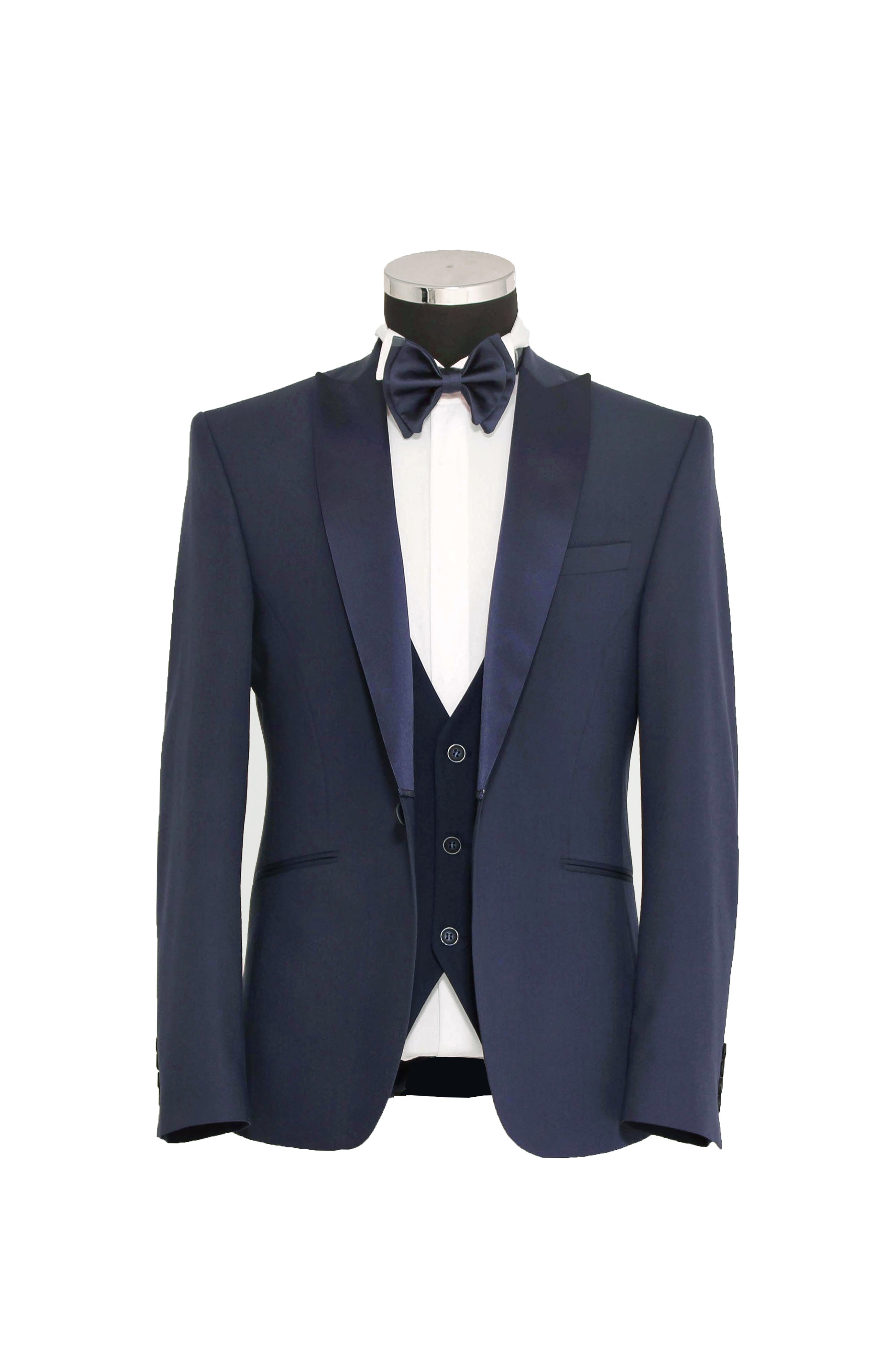 Smoking blu royal slim fit con collo a lancia e revers in raso rimovibile. Estremamente versatile: perfetto per la sera con revers in raso, adatto al giorno rimuovendo il doppio collo. Gilet a tre bottoni e papillon in tinta con i revers completano il look. Pantaloni slim fit con tasca a filo, per chi desidera distinguersi con eleganza assoluta.
