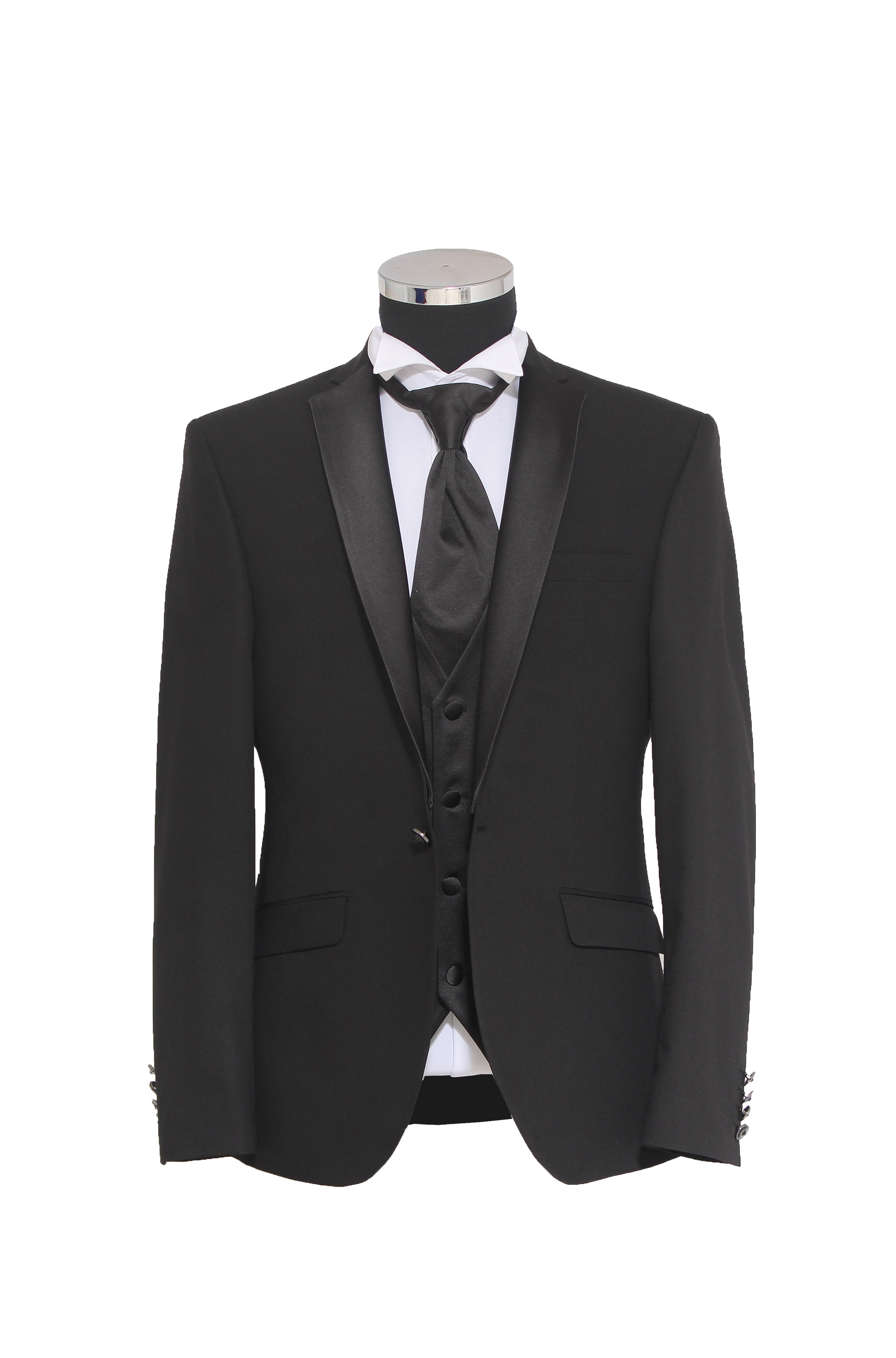 Abito smoking total black con collo a lancia e revers in raso. Giacca a un bottone, tasche con pattina a vista e gilet tono su tono a quattro bottoni rivestiti in tessuto. Il look è completato da un plastron coordinato, per uno stile sobrio e impeccabile, ideale per un incontro serale a lume di candela.