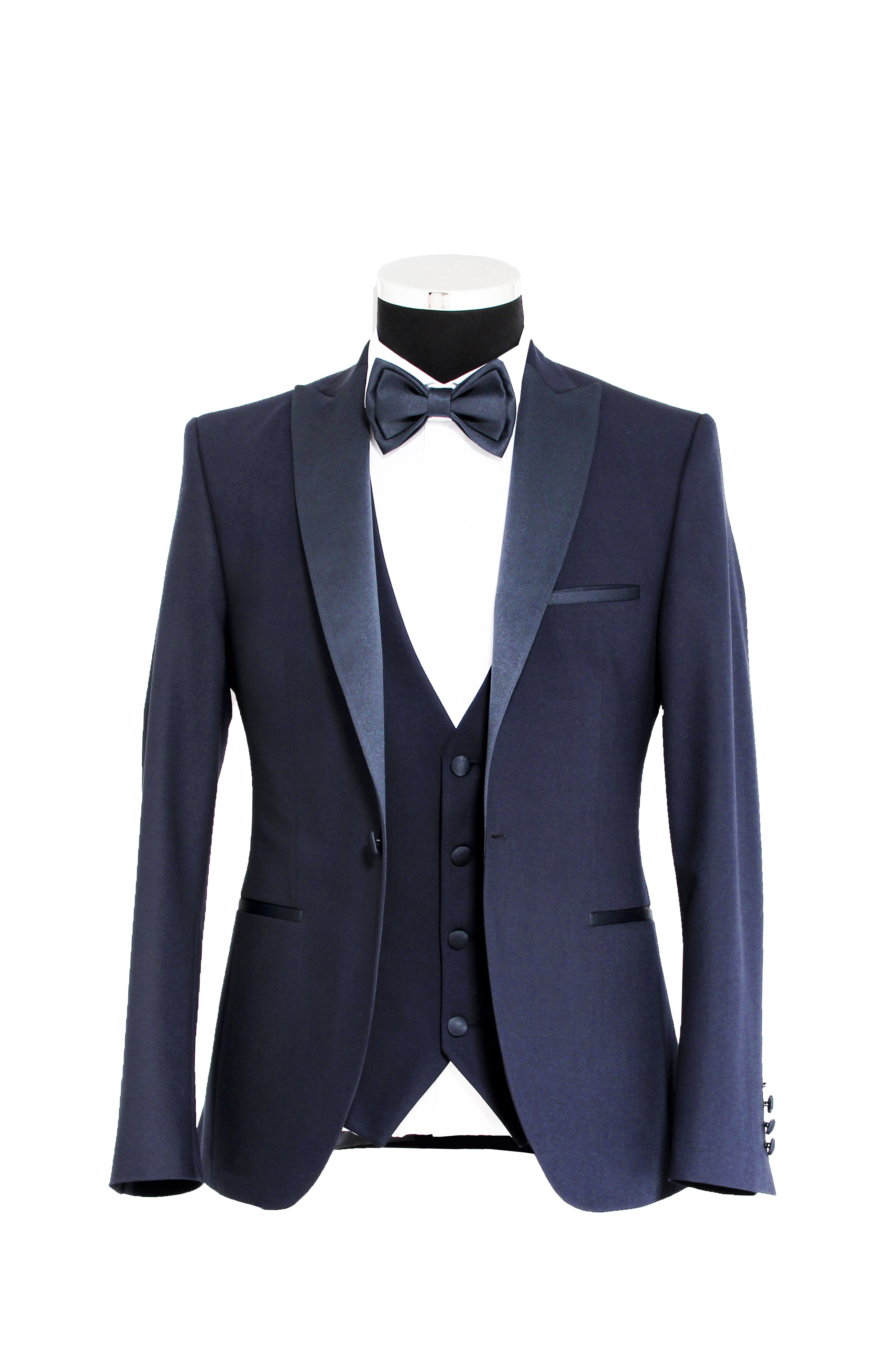 Abito smoking blu Navy con collo a lancia e dettagli in raso. Realizzato in tessuto elasticizzato, unisce comfort ed eleganza per chi desidera distinguersi senza rinunciare alla praticità. Un must-have del guardaroba maschile, perfetto per eventi speciali in ogni stagione.