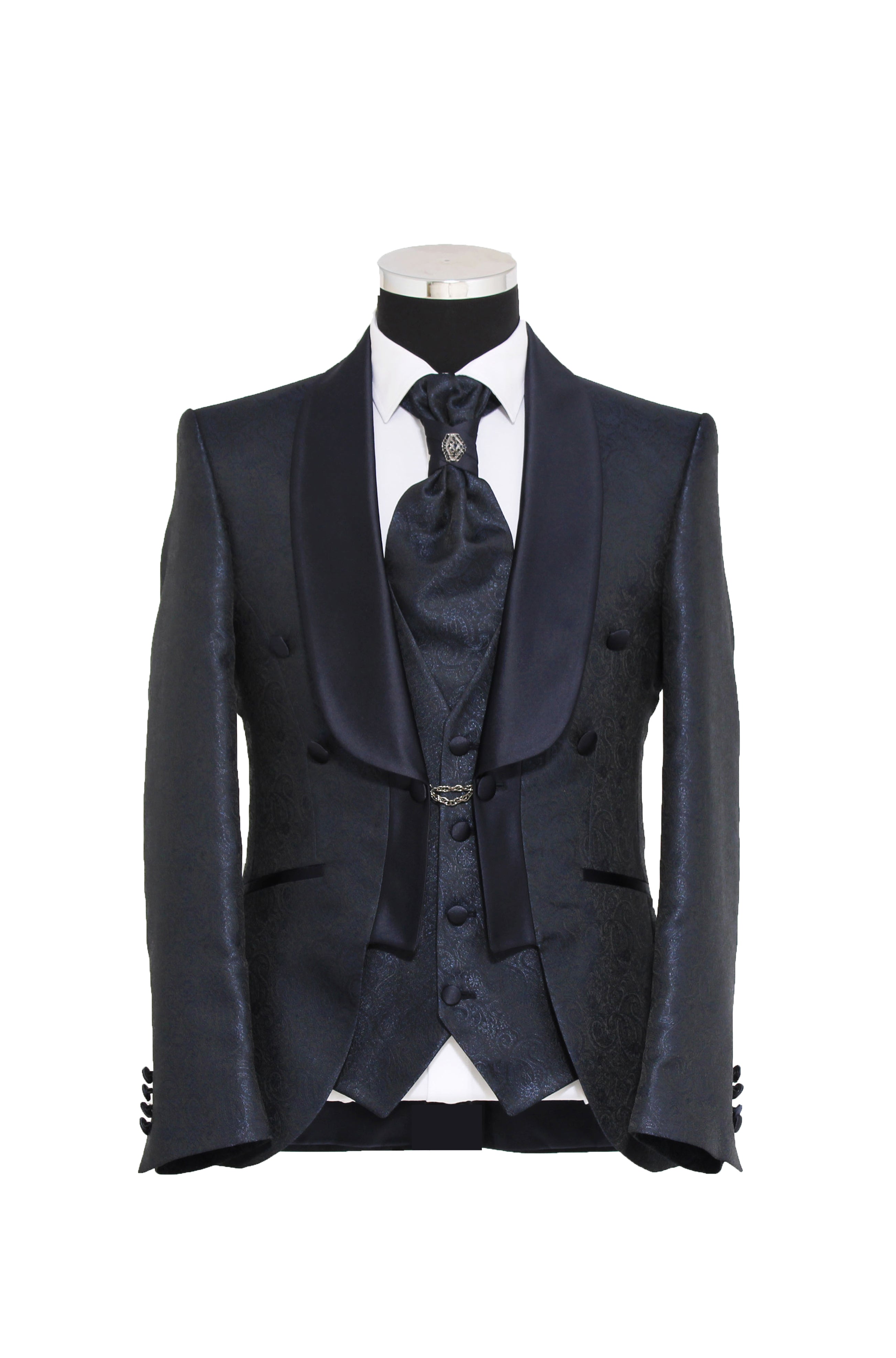 Abito da sposo demi-frack total blu in tessuto broccato tono su tono. Giacca con collo a scialle largo in raso e chiusura con alamaro. Gilet a quattro bottoni rivestiti in raso, plastron coordinato e spilla gioiello. Pantaloni tinta unita dalla linea slim fit per un look raffinato e magnetico. Perfetto per un evento dal sapore da "mille e una notte", pensato per un uomo seducente e misterioso.