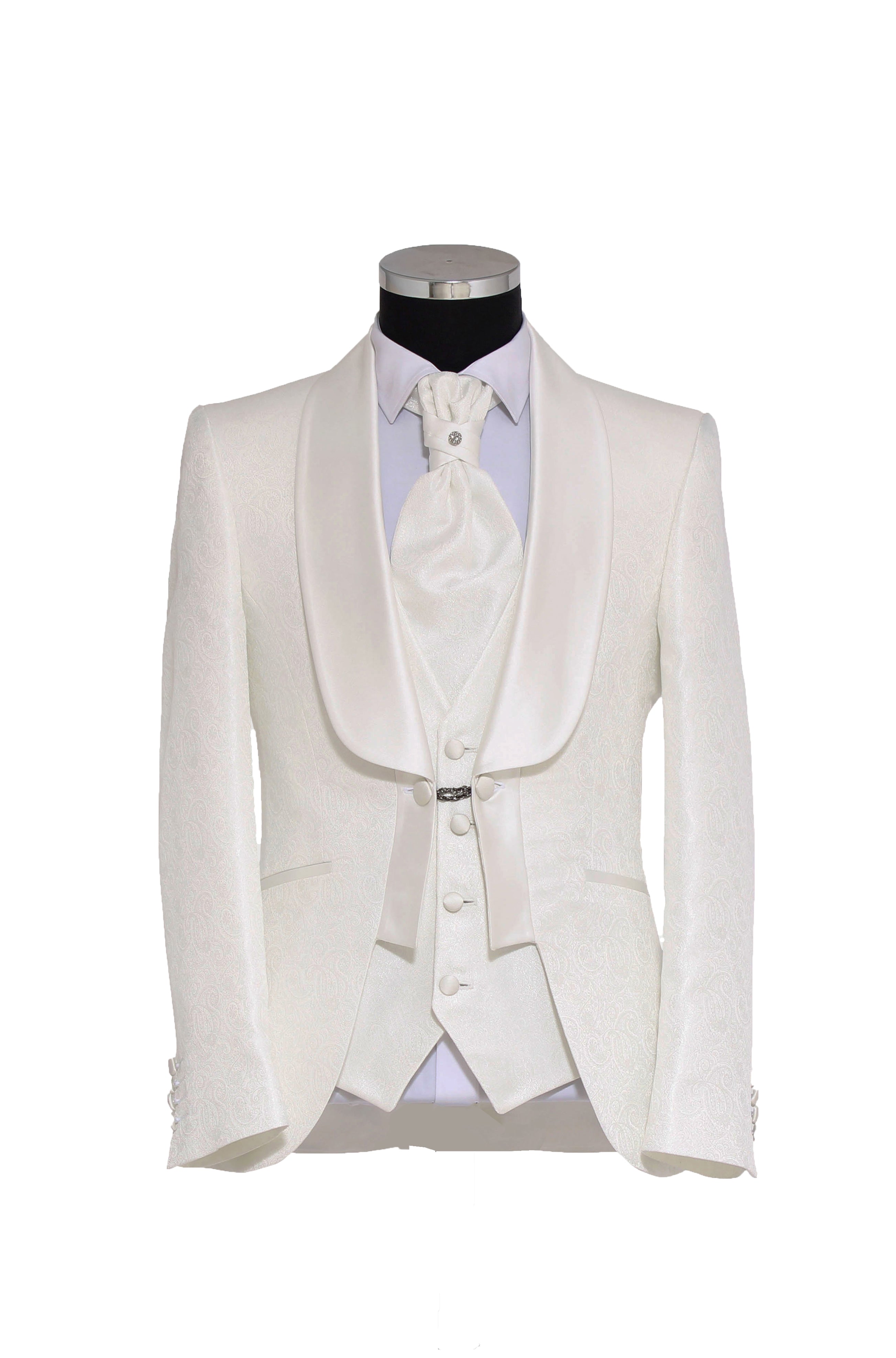 Abito da sposo demi-frack total white, realizzato in tessuto broccato tono su tono che esalta raffinatezza e luminosità. La giacca, caratterizzata da un ampio collo a scialle in raso e una chiusura con alamaro, si distingue per la sua eleganza senza tempo. Il gilet a quattro bottoni, sapientemente rivestito in raso, si abbina armoniosamente a un plastron finemente lavorato e una spilla gioiello, simbolo di artigianalità. I pantaloni, in tinta unita e dalla linea slim, completano l’insieme per un look sofisticato che richiama le acque cristalline del Mediterraneo.
