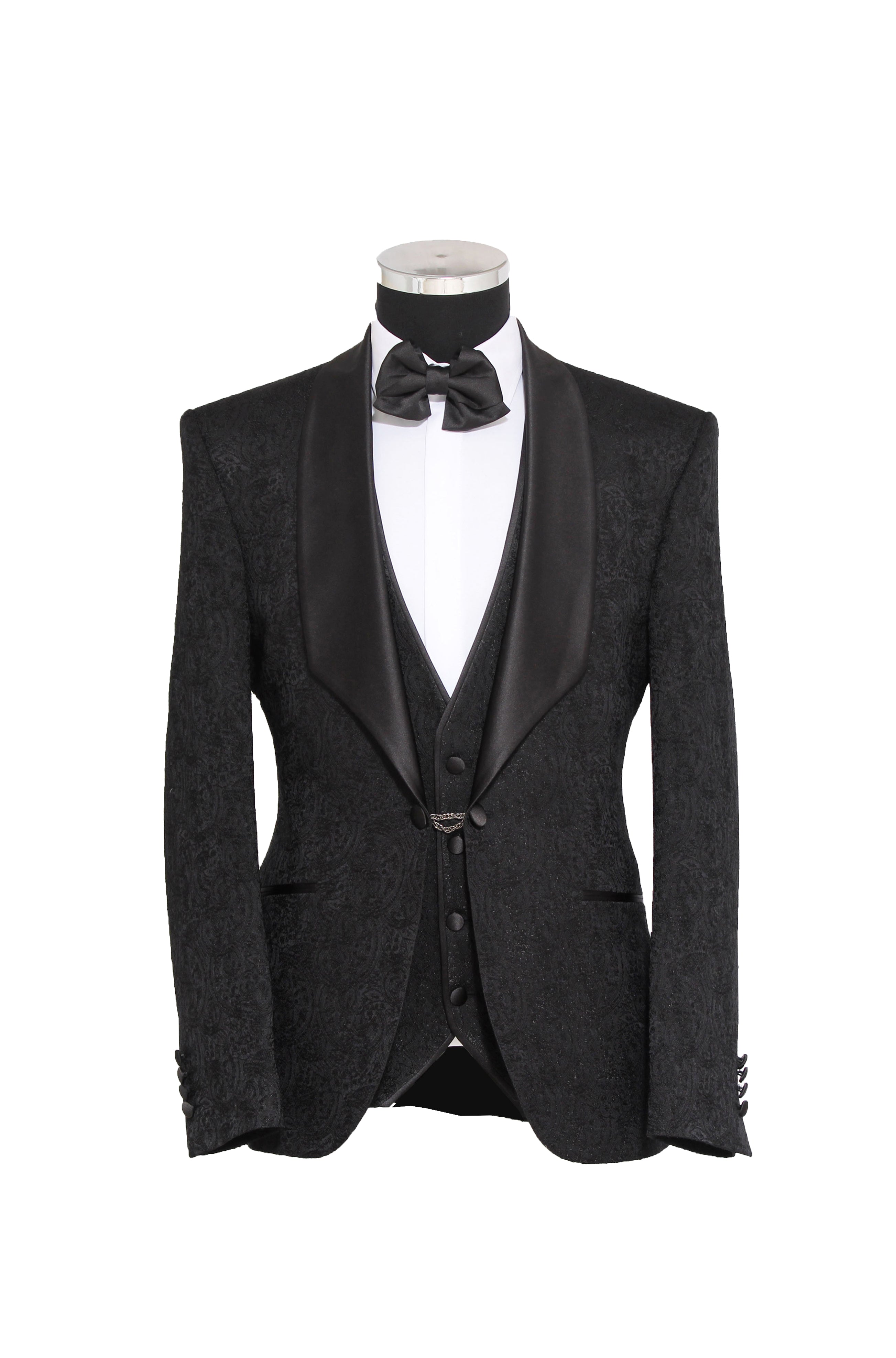 Abito da sposo nero in broccato con motivi cashmere, collo a scialle largo in raso nero, in coordinato con gilet quattro bottoni, papillon e pantaloni. Chiusura giacca con alamaro a vista.
