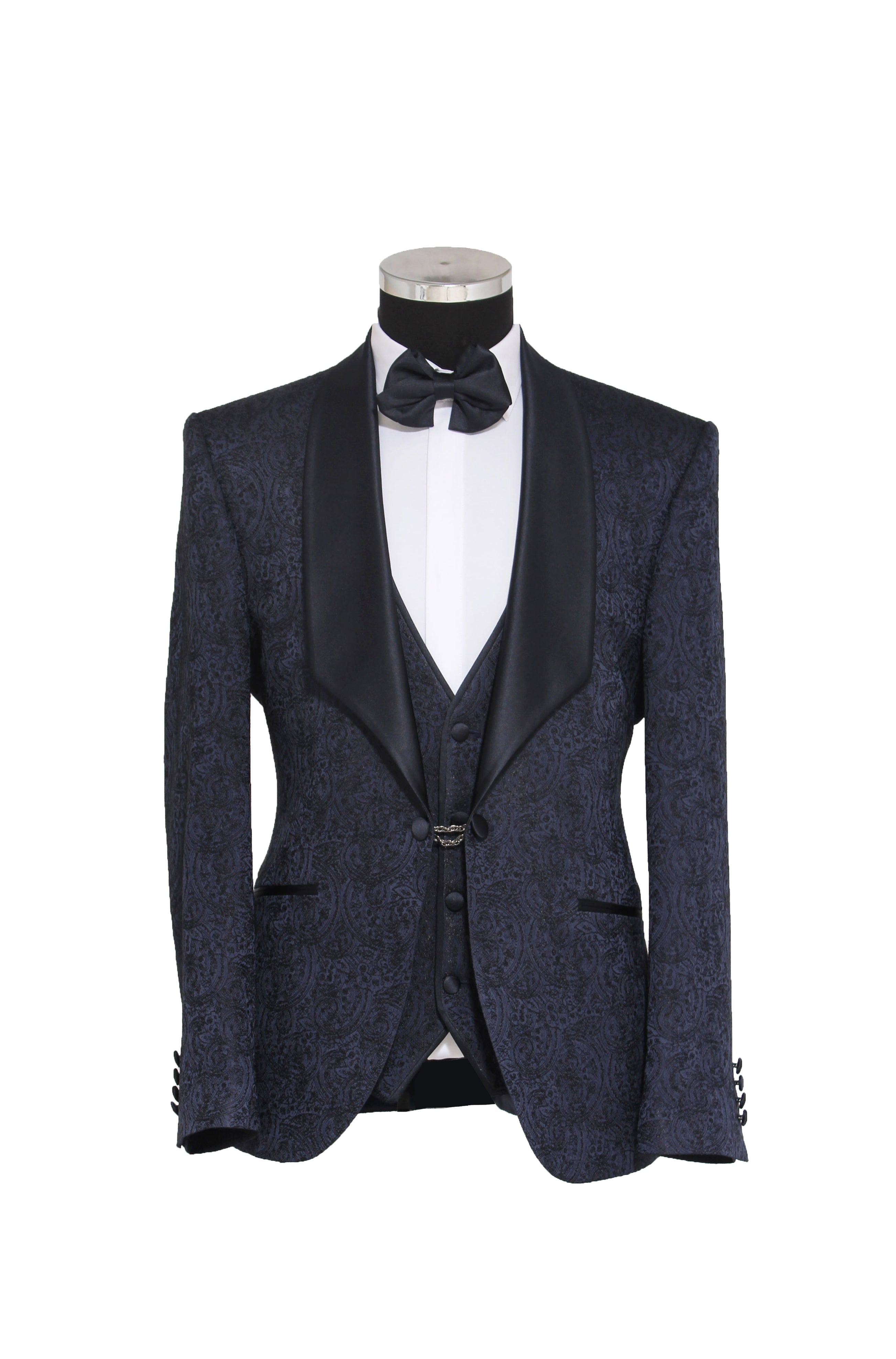 Abito da sposo blu navy in broccato con motivi cashmere, collo a scialle largo in raso blu e chiusura ad alamaro a vista. Gilet a quattro bottoni, papillon coordinato e pantaloni in tinta completano un look d’impatto. Un abito che evoca il lusso barocco in chiave moderna, perfetto per una cerimonia eclettica dal sapore bohemian.