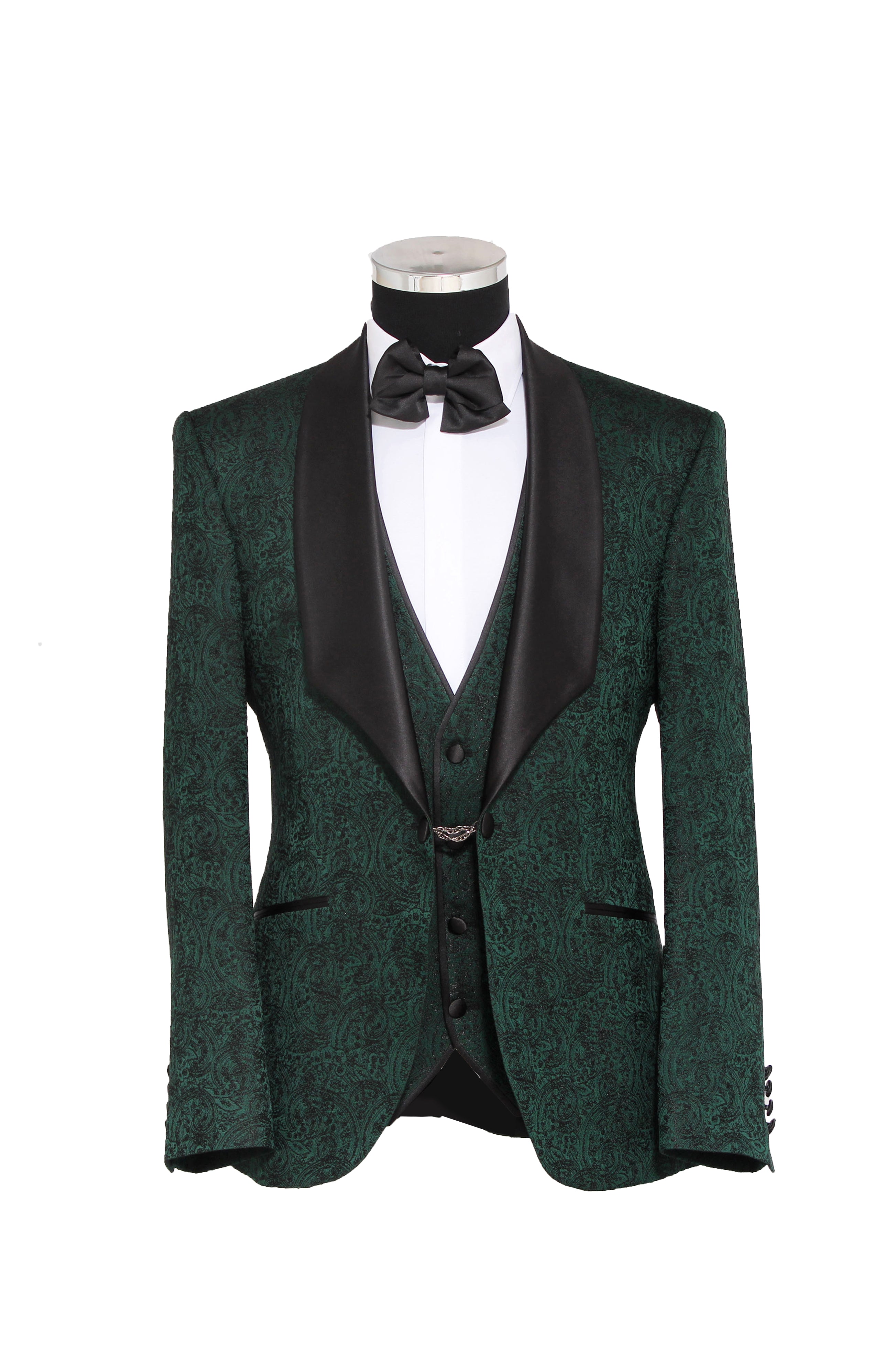 Abito da sposo verde bosco in jacquard con motivi cachemire, impreziosito da collo a scialle largo in raso nero e chiusura ad alamaro a vista. Il gilet a quattro bottoni e il papillon coordinato completano un look che richiama il lusso barocco, reinterpretato in chiave contemporanea. Perfetto per una cerimonia eclettica e fuori dagli schemi.