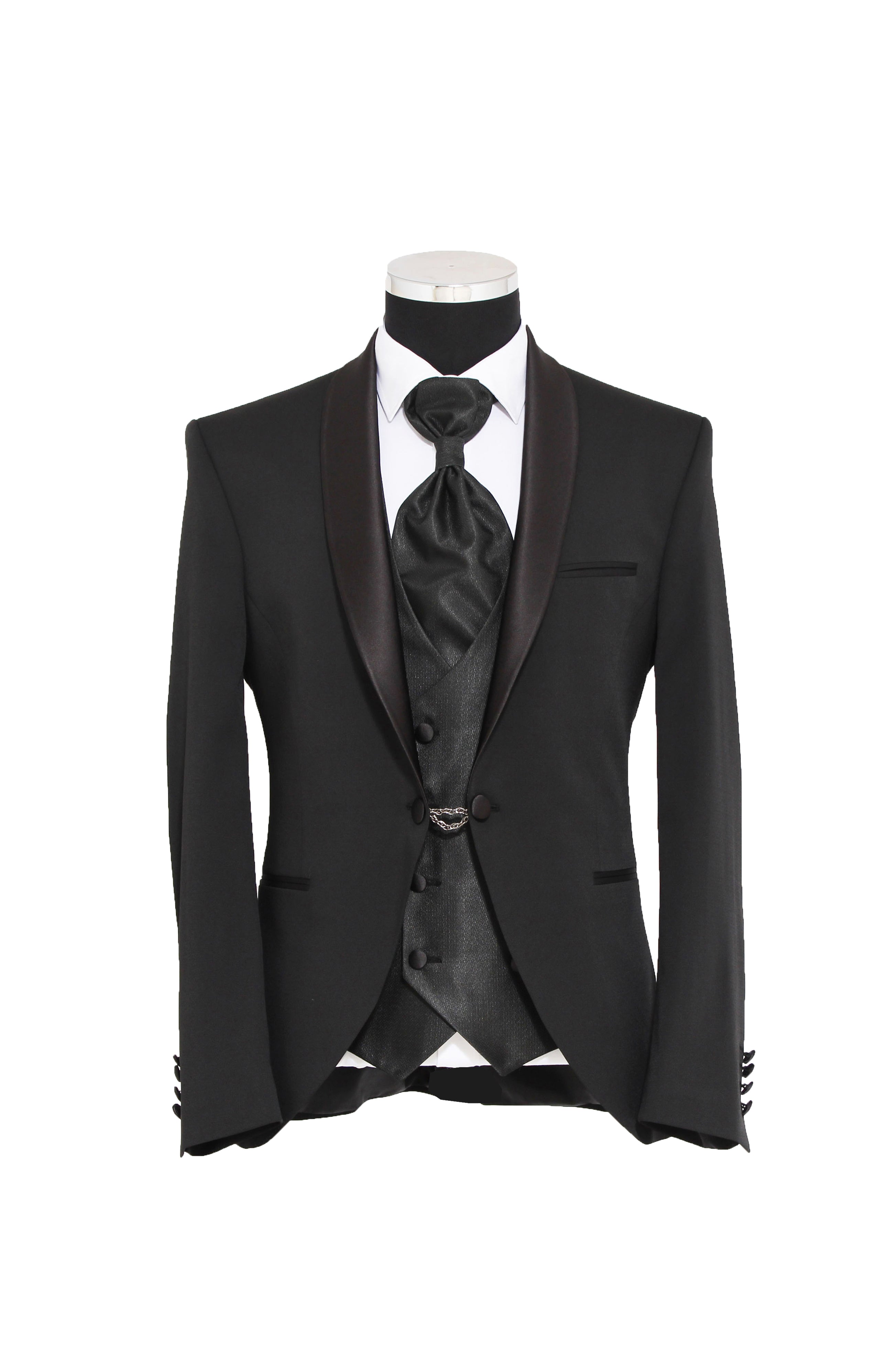 Smoking total black con collo a scialle e chiusura ad alamaro nascosto. Gilet doppiopetto in tessuto micro lavorato abbinato a plastron coordinato. Pantaloni dal taglio impeccabile completano un look raffinato e moderno, pensato per chi non rinuncia all’irresistibile seduzione del total black.