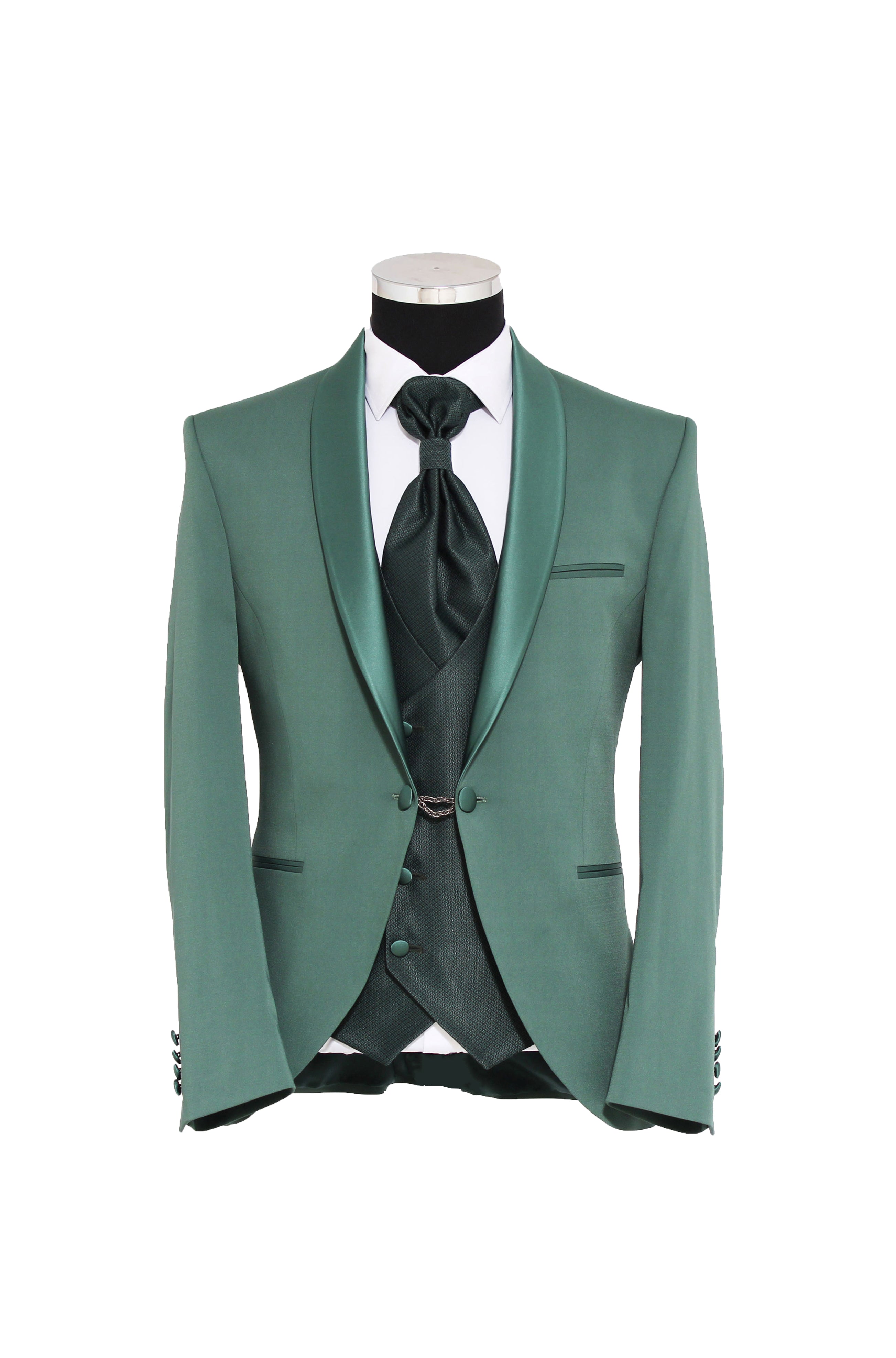 Smoking verde mare, ideale per un beach wedding. Giacca asciutta con collo a scialle e alamaro a vista, abbinata a un gilet doppiopetto in contrasto verde oliva con bottoni in raso rivestiti. Plastron coordinato e pantaloni dal taglio impeccabile completano un look raffinato e moderno, pensato per uno sposo giovane e fashion.