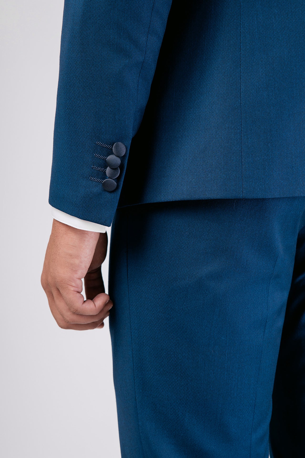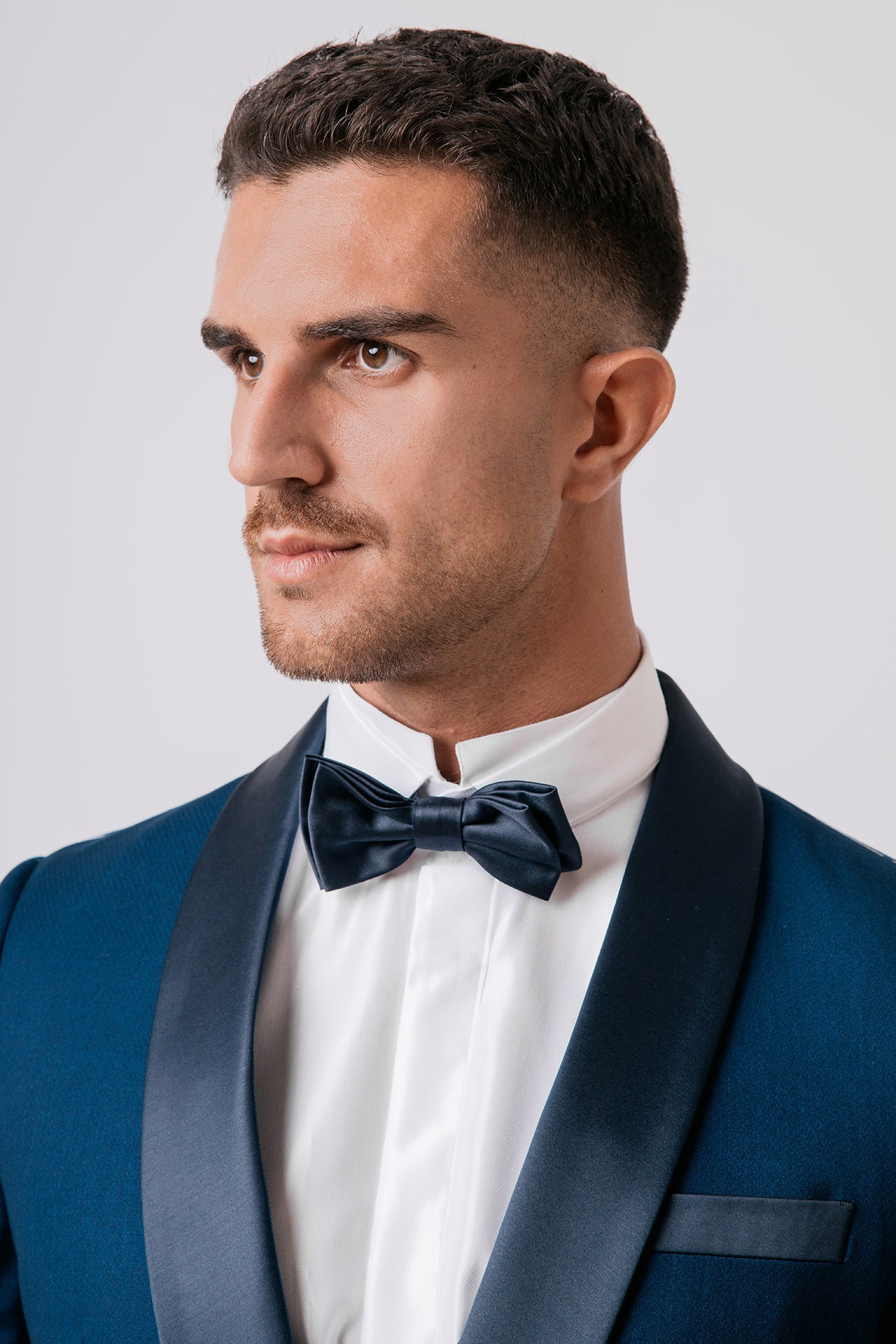 Abito con papillon e gilet in tessuto misto lana color bluette, impreziosito da dettagli in raso a contrasto. Un look fresco e sofisticato, perfetto per chi ama distinguersi con stile.