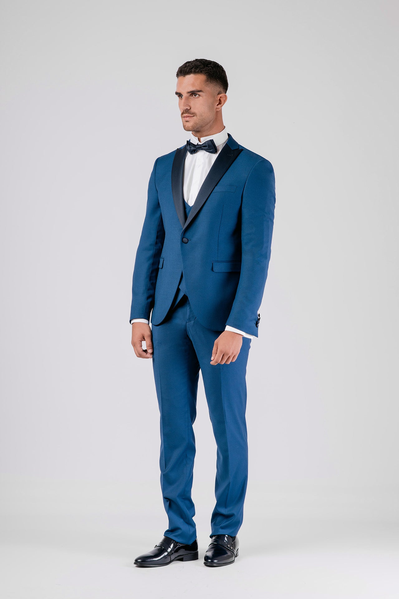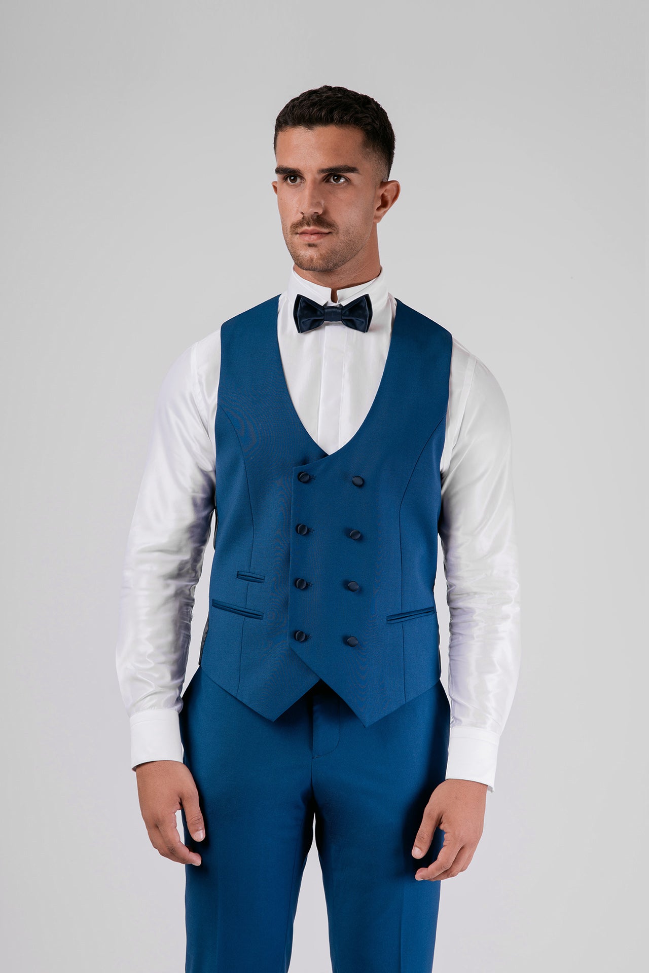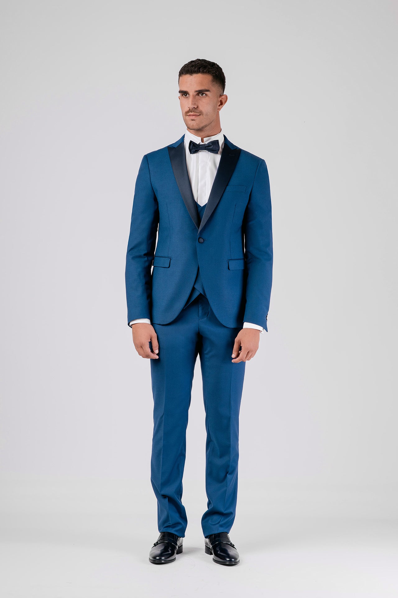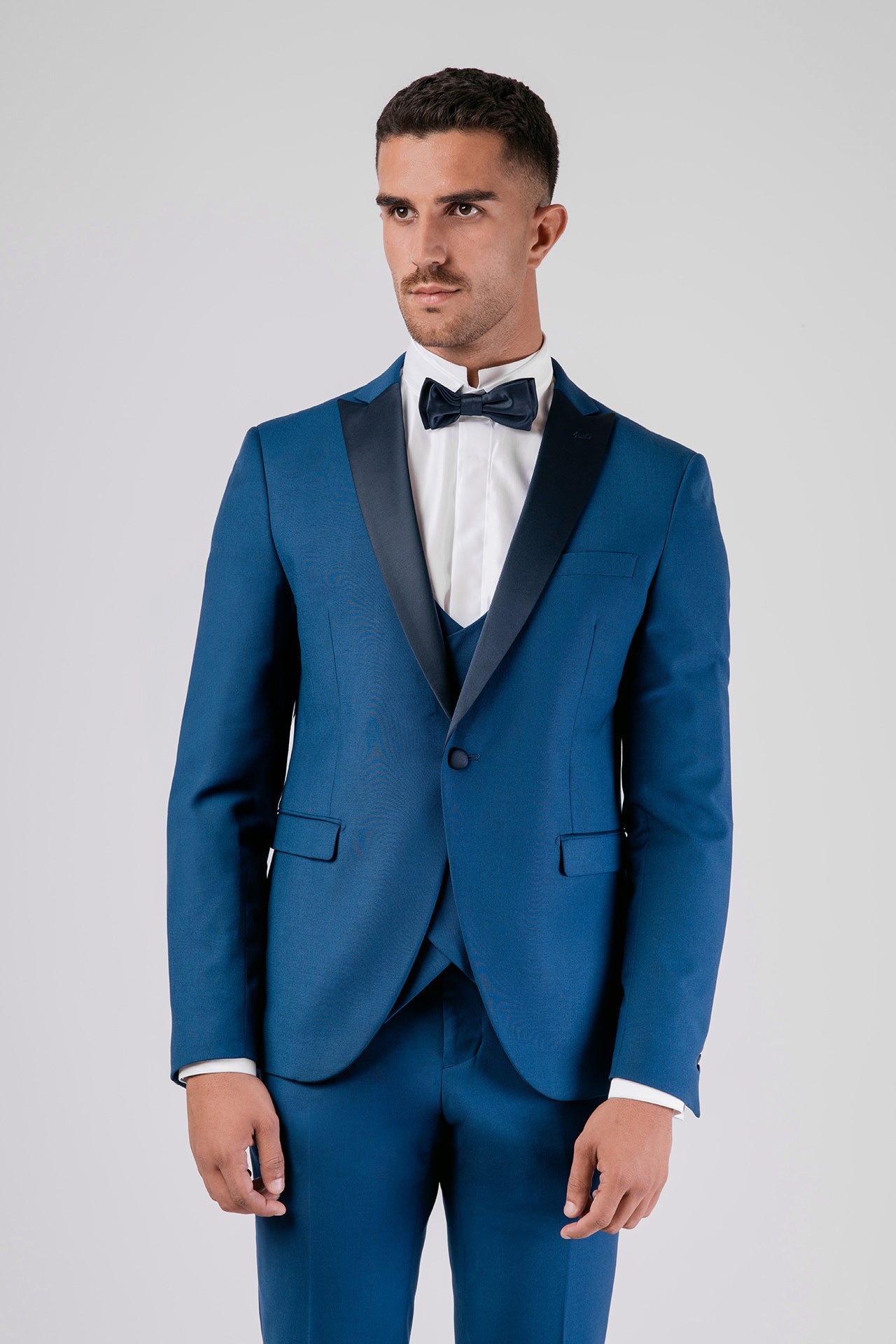Abito in tessuto misto lana color bluette con dettagli in raso a contrasto. Gilet e papillon coordinati completano un look elegante, dal gusto contemporaneo e versatile.
