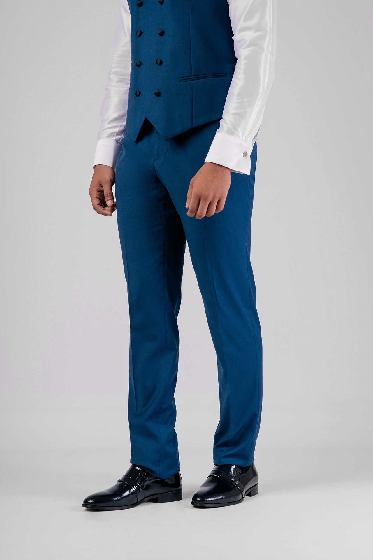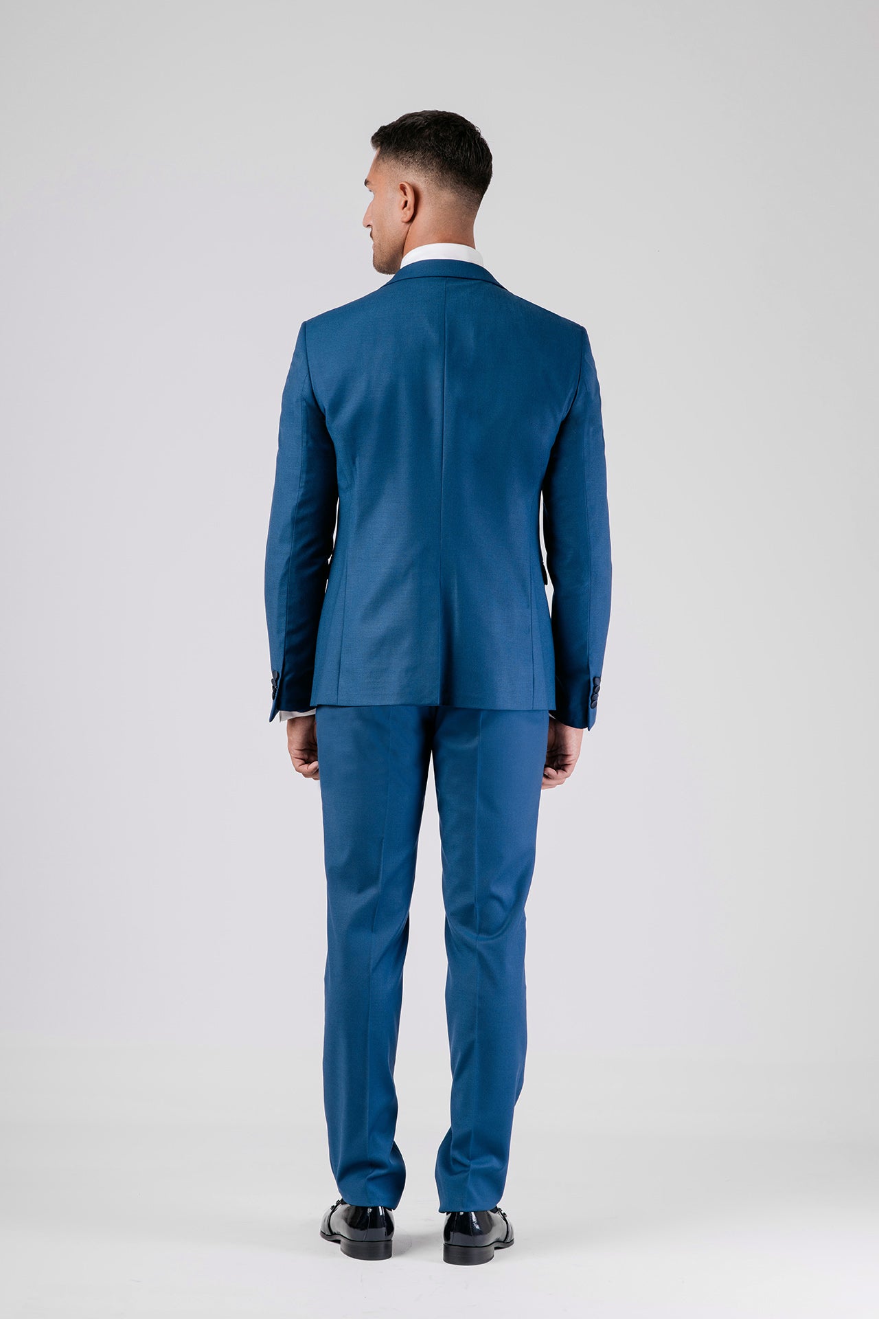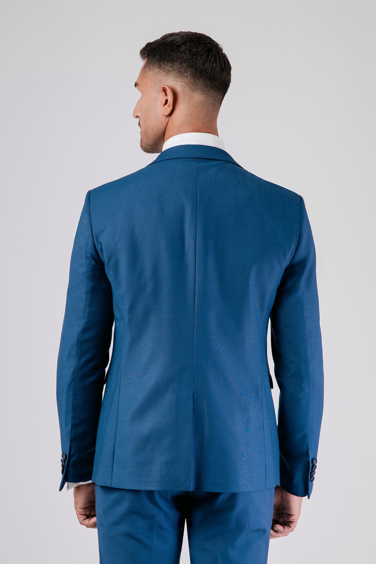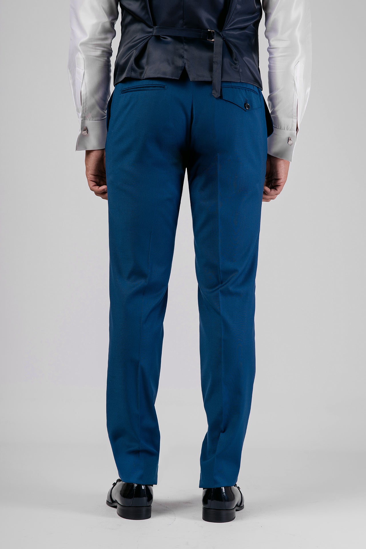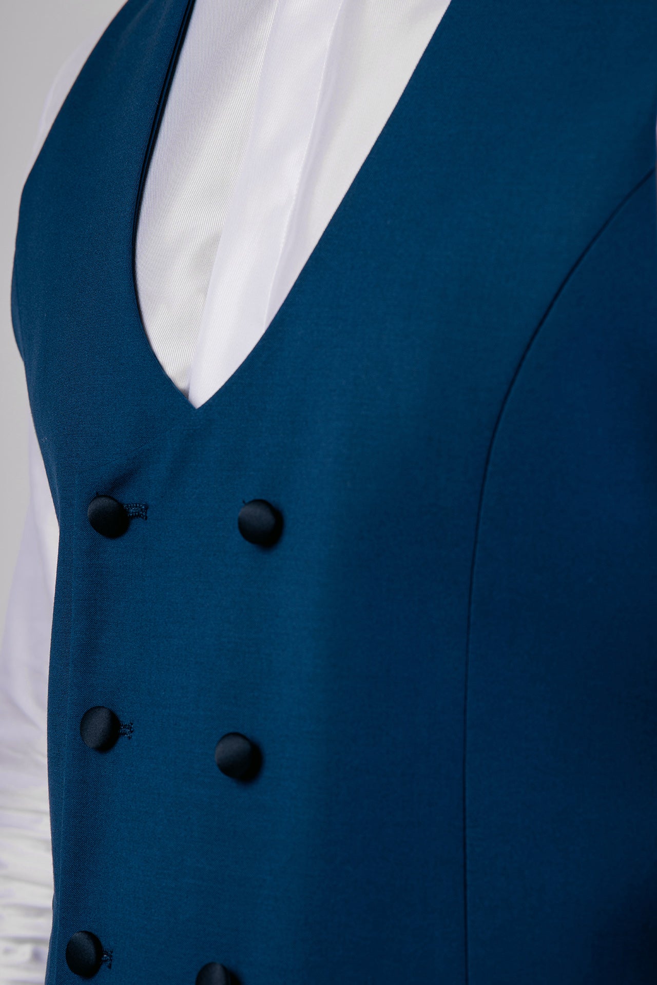 Abito in tessuto misto lana color bluette con dettagli in raso a contrasto. Gilet e papillon coordinati completano un look elegante, dal gusto contemporaneo e versatile.