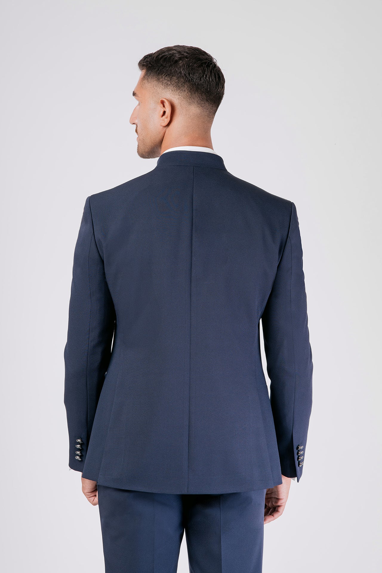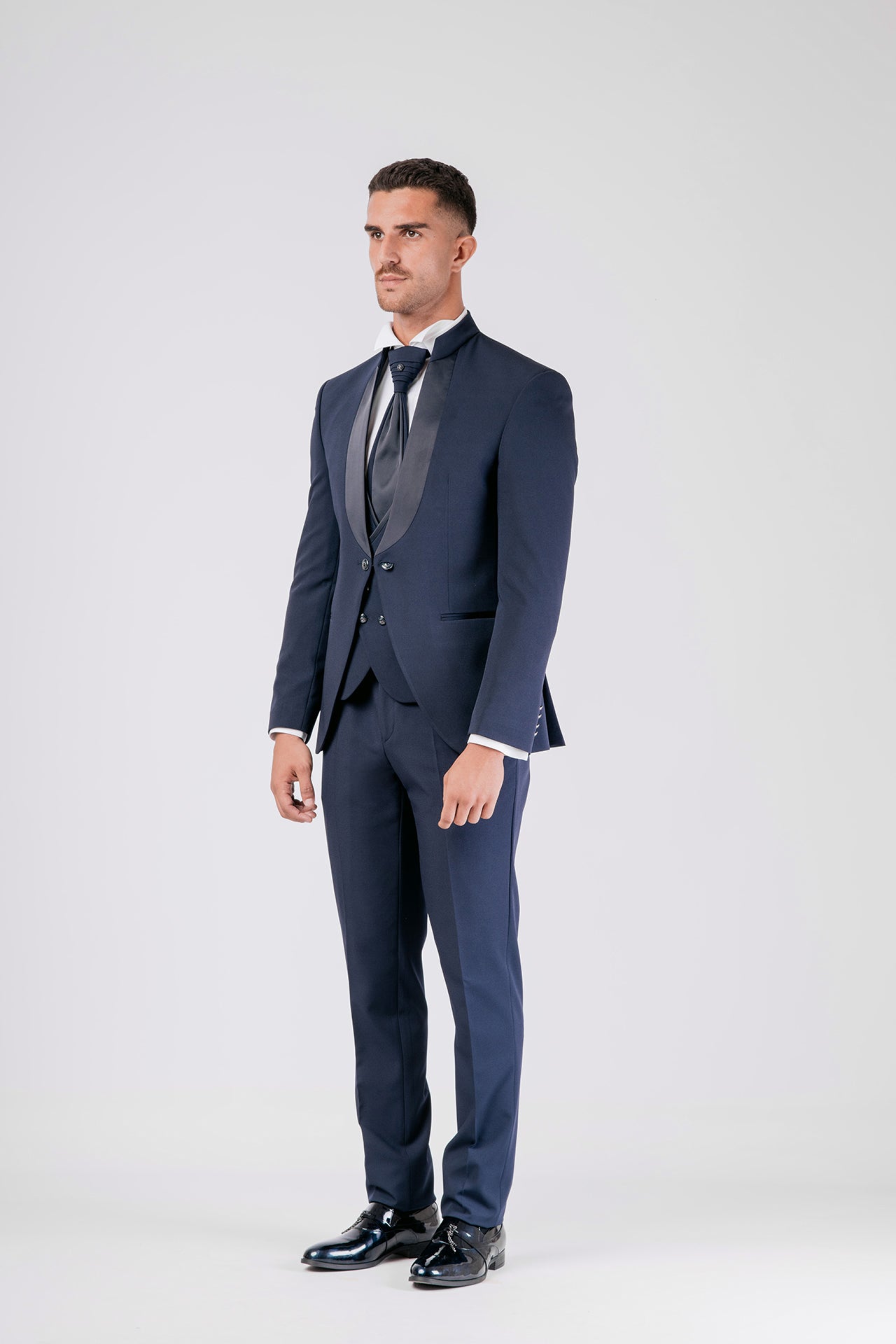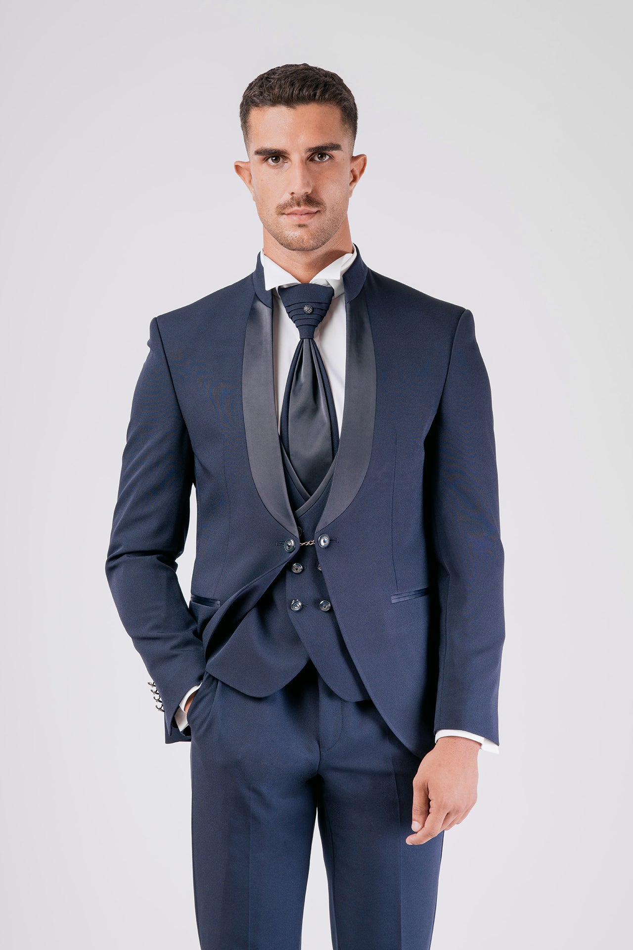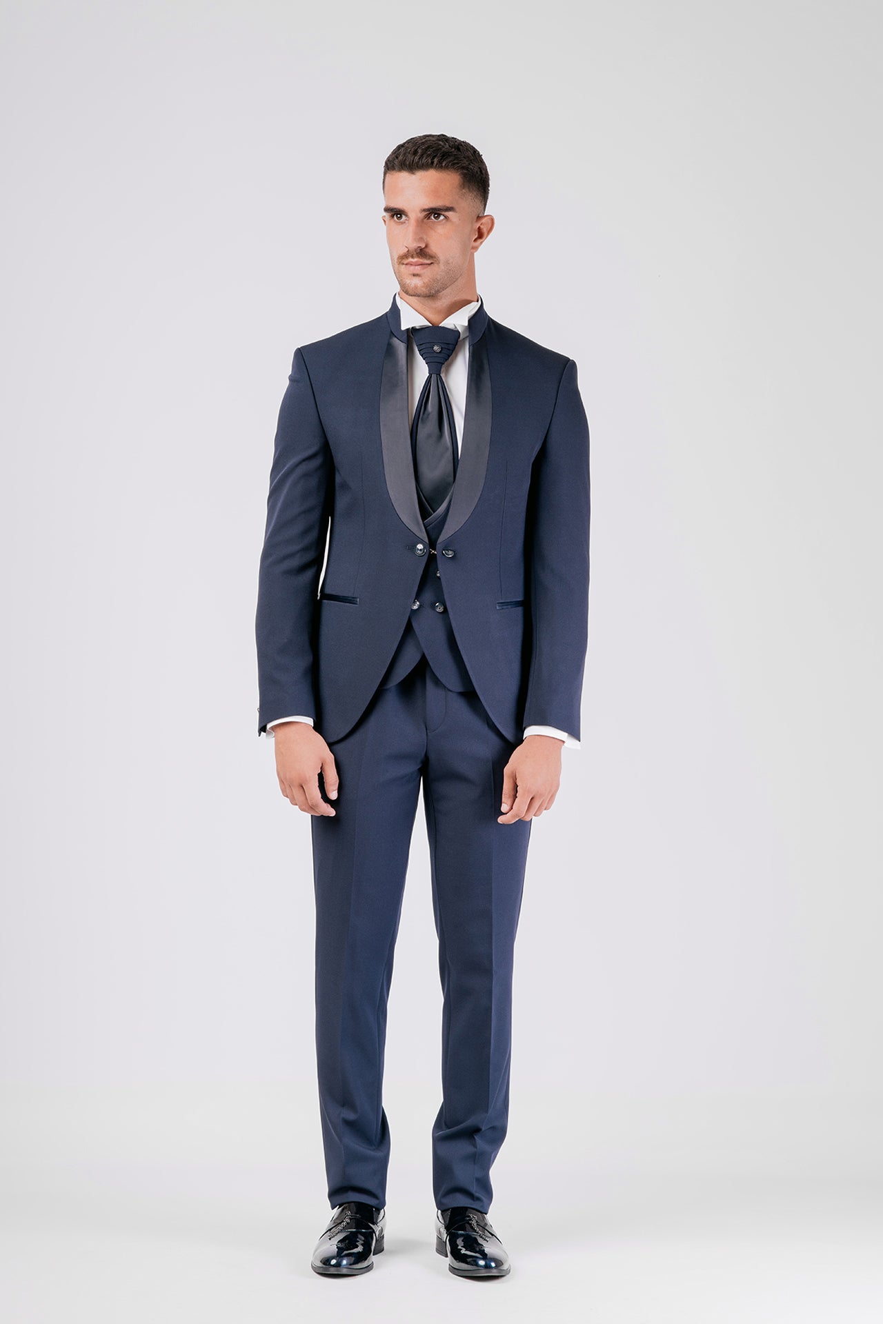 Abito da sposo con collo coreano in tessuto elasticizzato, impreziosito da dettagli in raso blu sul collo. Una scelta raffinata e decisa per lo sposo moderno che cerca struttura, comfort e un tocco di colore distintivo.