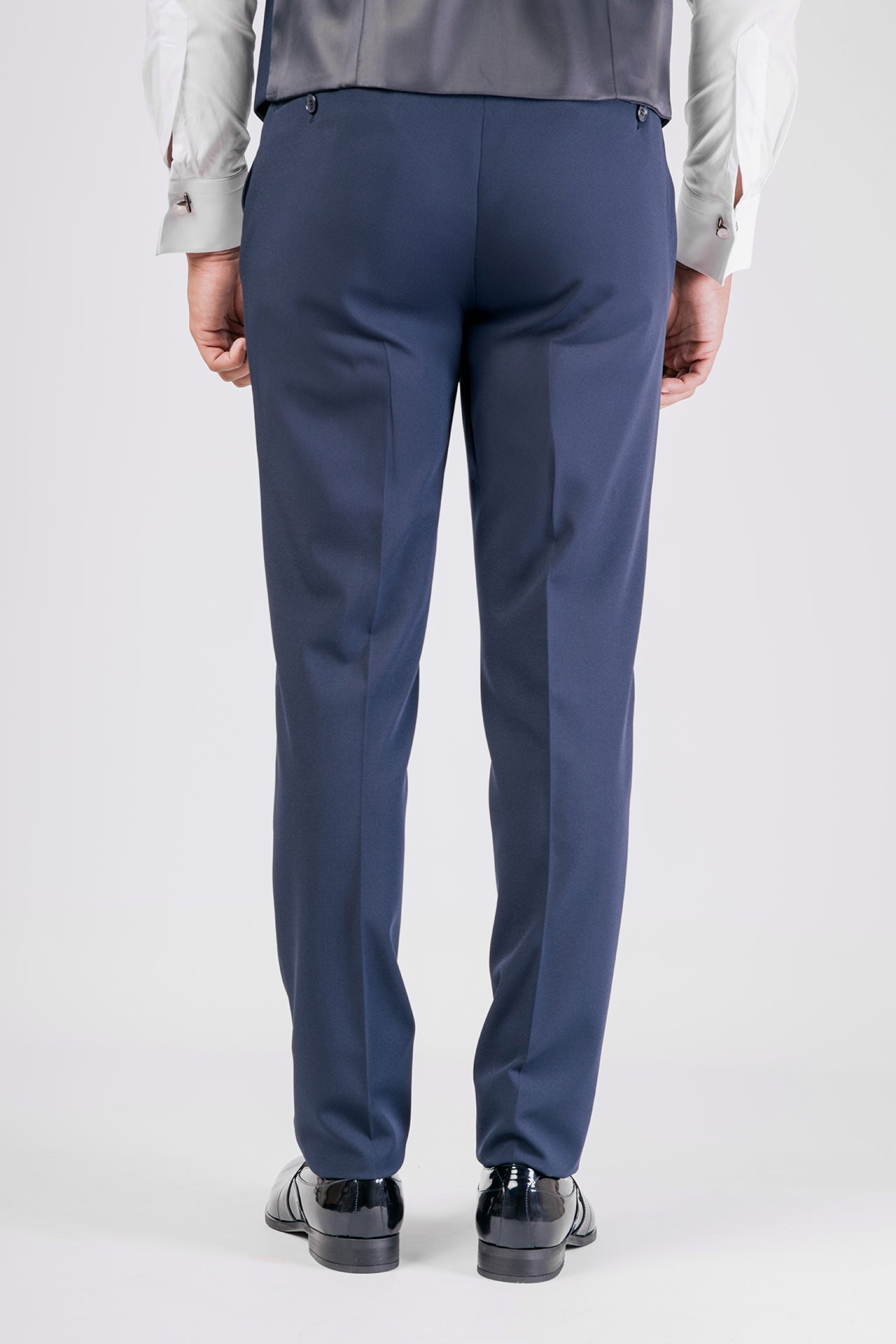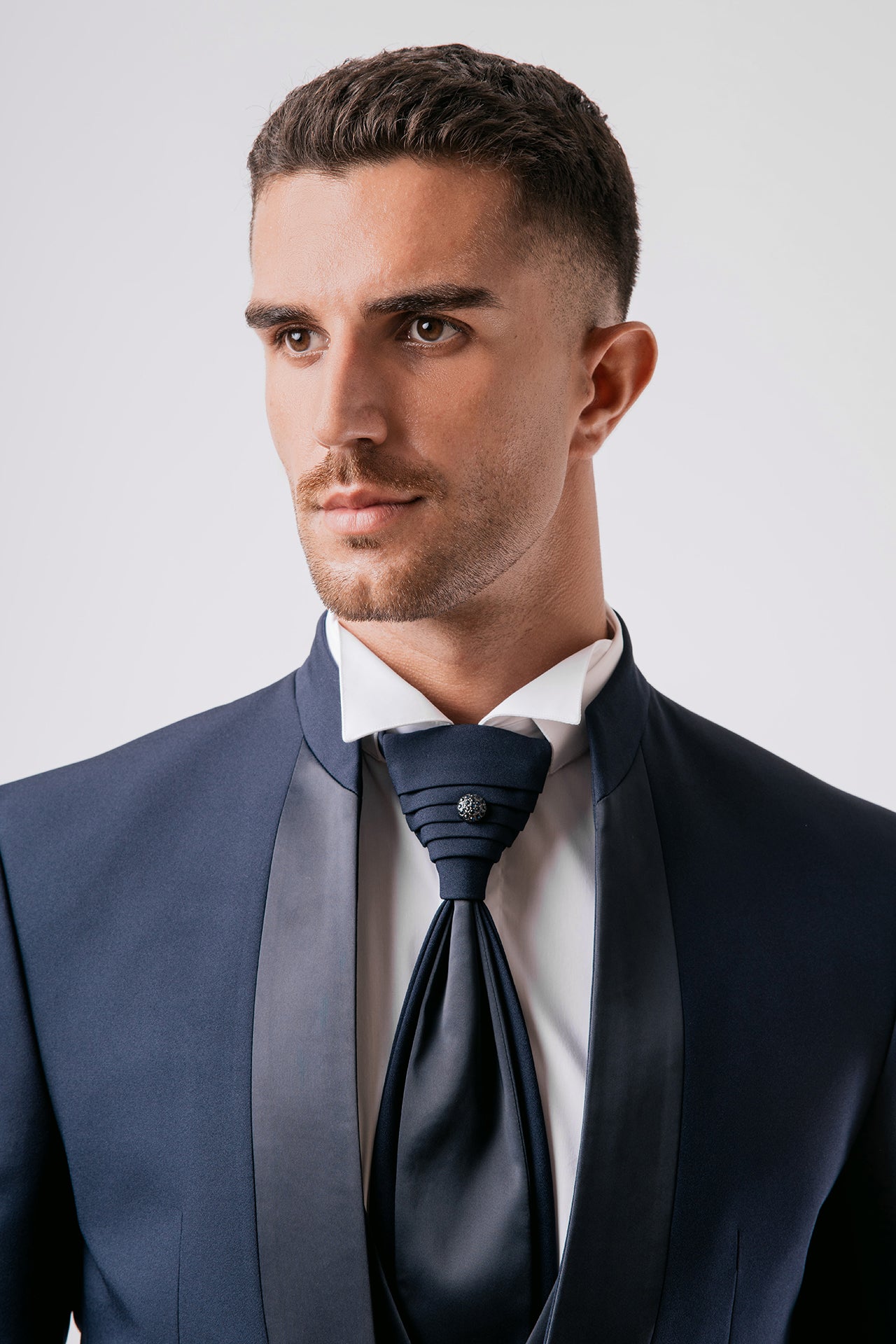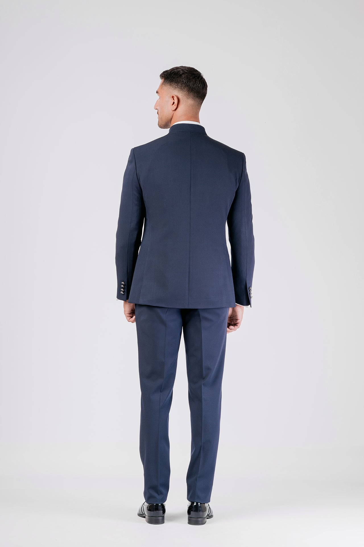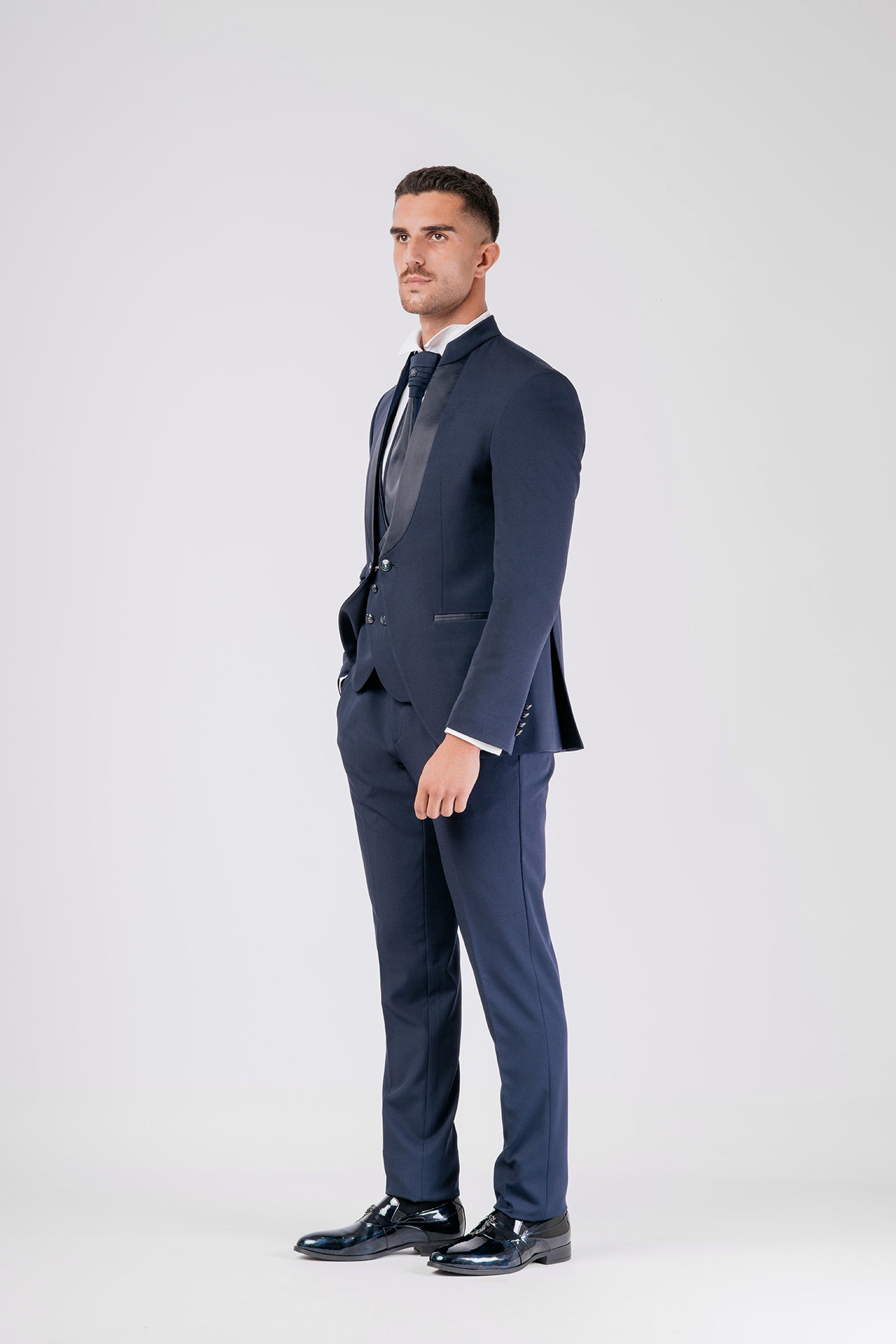Abito da sposo con collo coreano in tessuto elasticizzato, impreziosito da dettagli in raso blu sul collo. Una scelta raffinata e decisa per lo sposo moderno che cerca struttura, comfort e un tocco di colore distintivo.