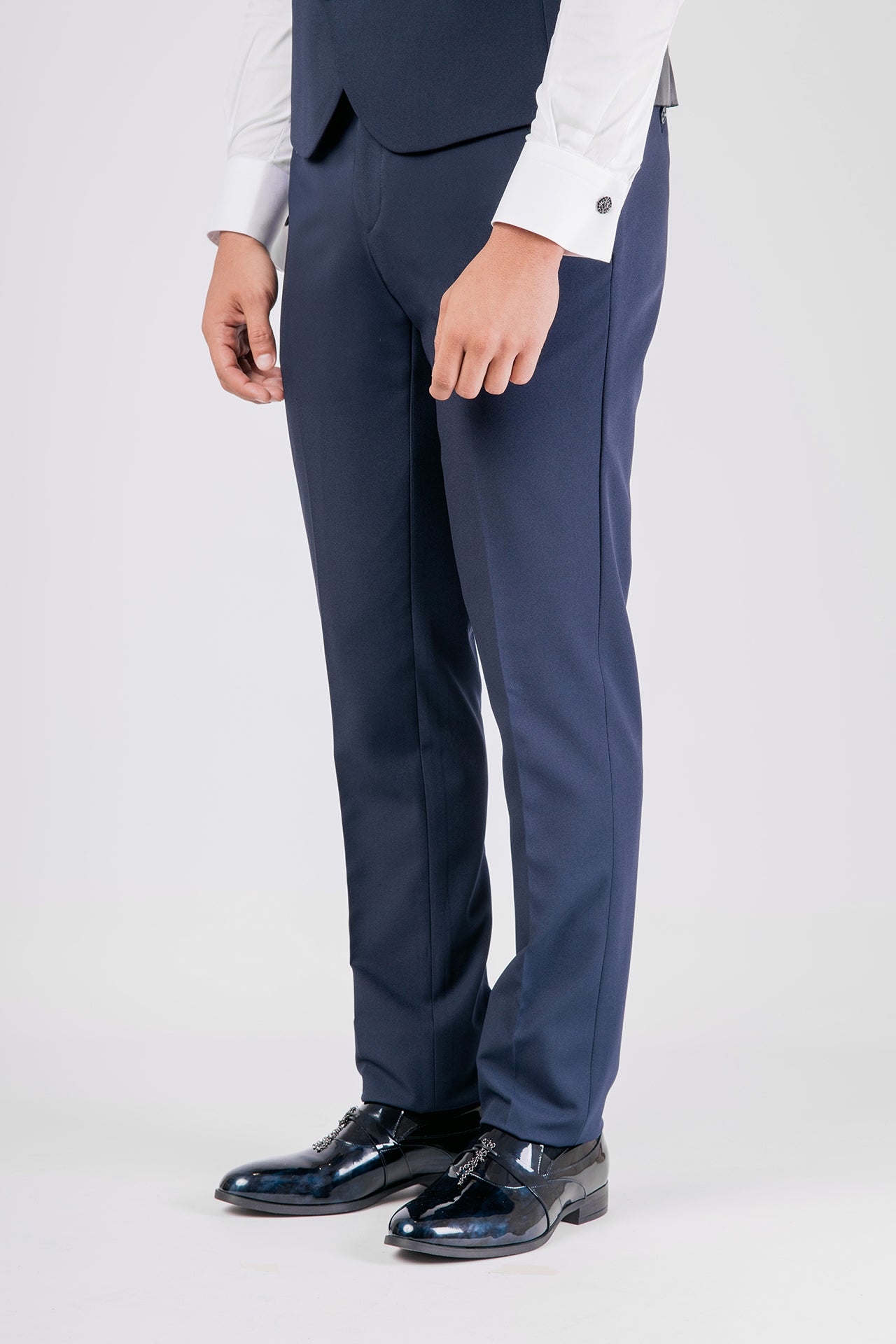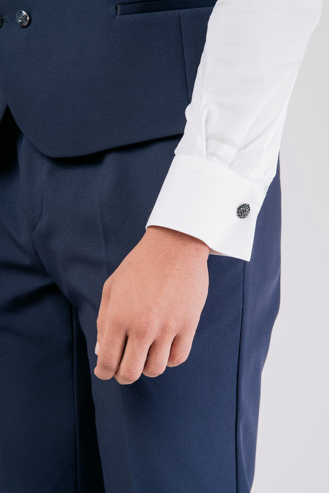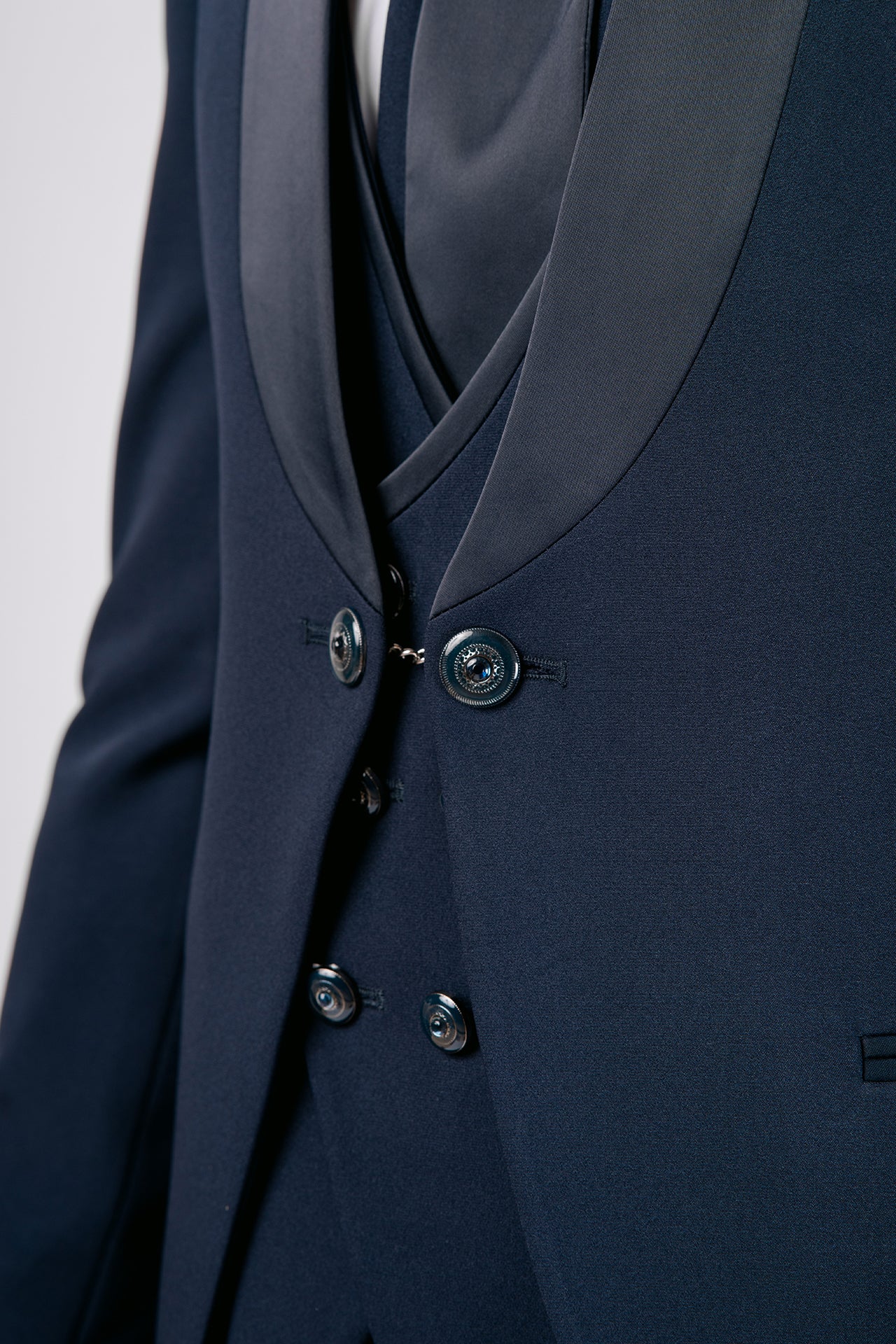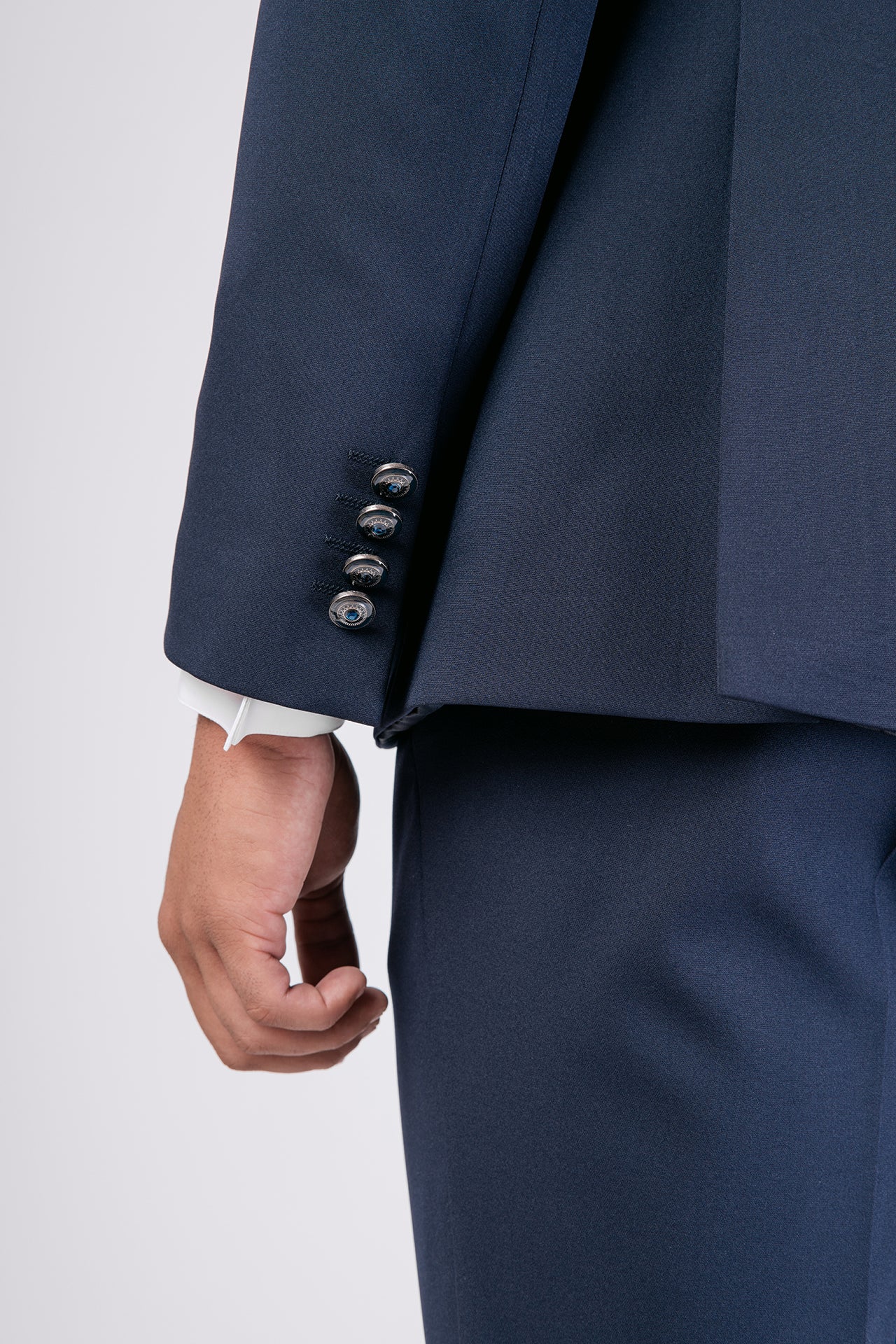 Abito da sposo con collo coreano in tessuto elasticizzato, impreziosito da dettagli in raso blu sul collo. Una scelta raffinata e decisa per lo sposo moderno che cerca struttura, comfort e un tocco di colore distintivo.