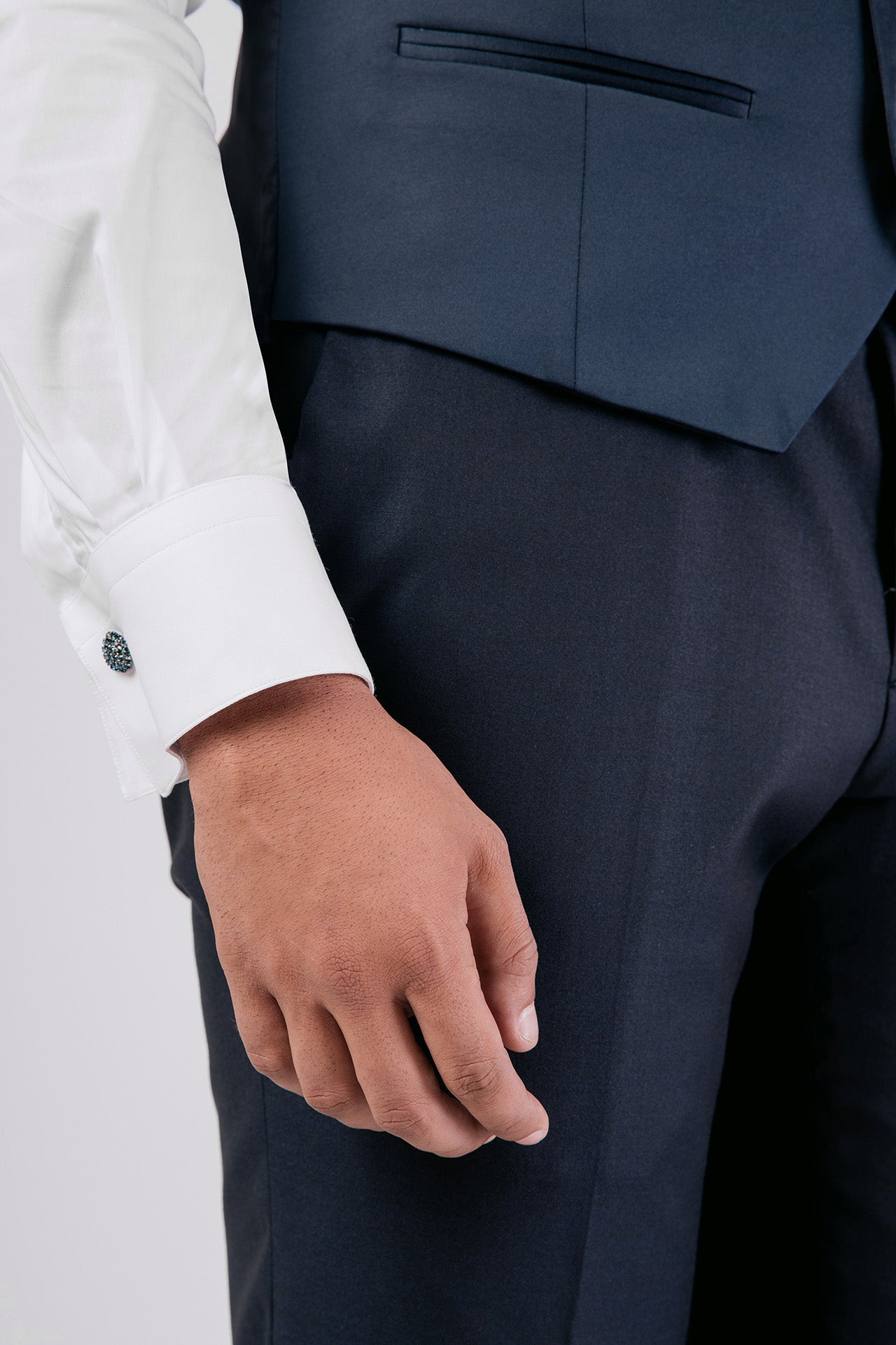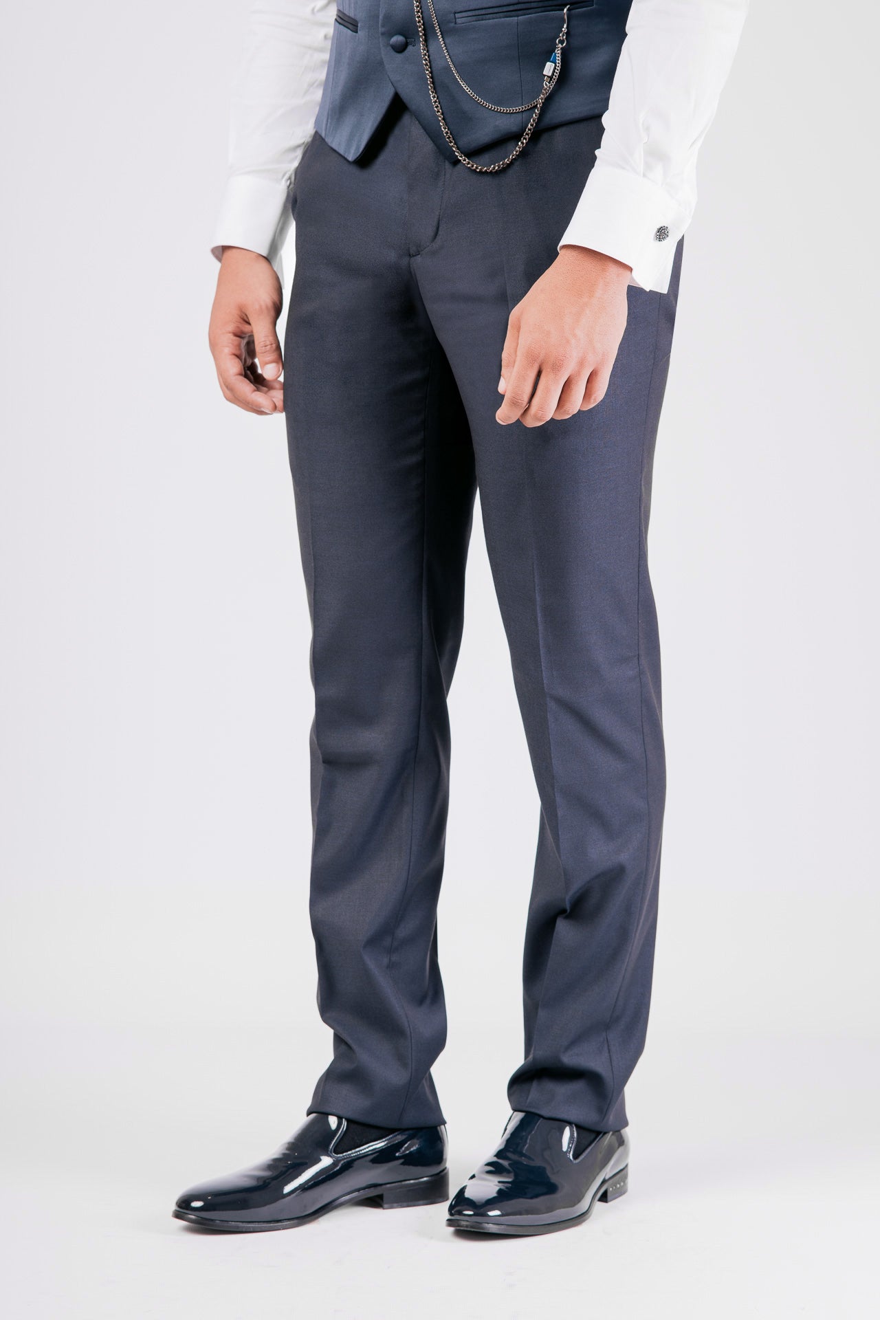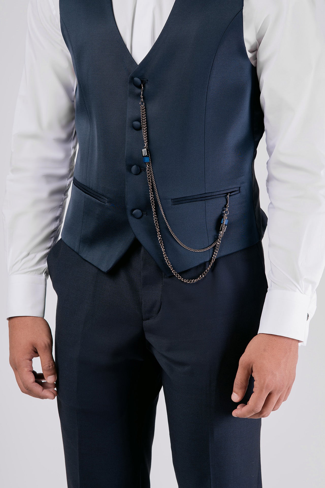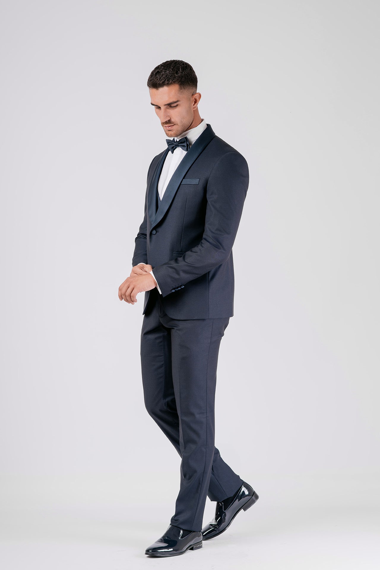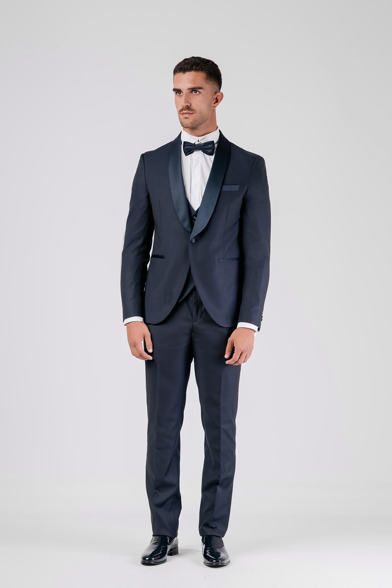 Abito con papillon e gilet in tessuto misto lana color blu, impreziosito da dettagli in raso a contrasto. Un completo dal design essenziale e raffinato, ideale per chi cerca equilibrio tra eleganza e sobrietà.