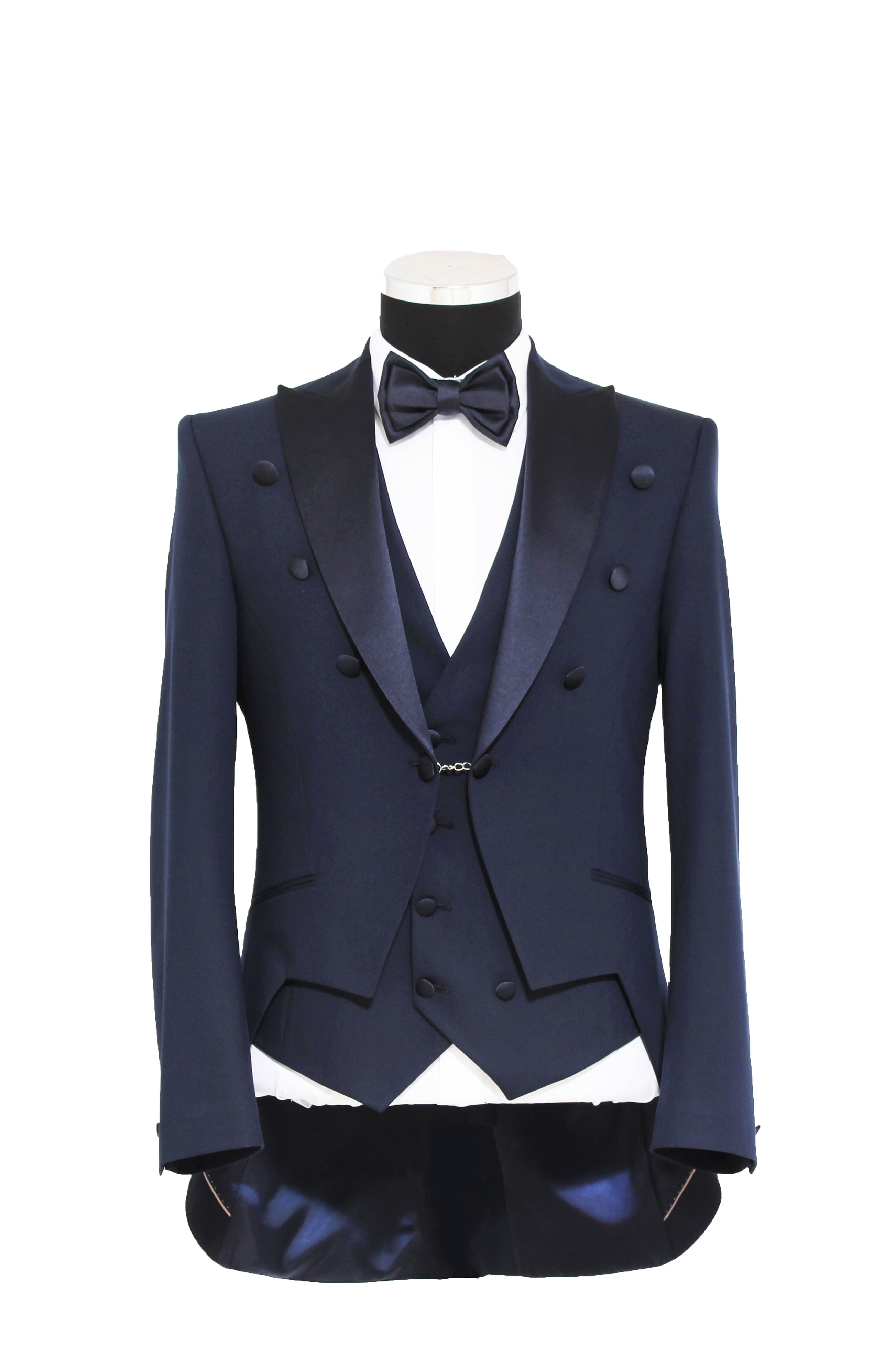 Abito mezzo frack total blu con revers a lancia largo 12 cm in raso e chiusura giacca stile alamaro. Gilet doppiopetto a sei bottoni rivestiti in tessuto, papillon in raso e pantaloni modern fit completano il look. Un richiamo all’eleganza aristocratica, pensato per il gentleman contemporaneo che cura ogni dettaglio.