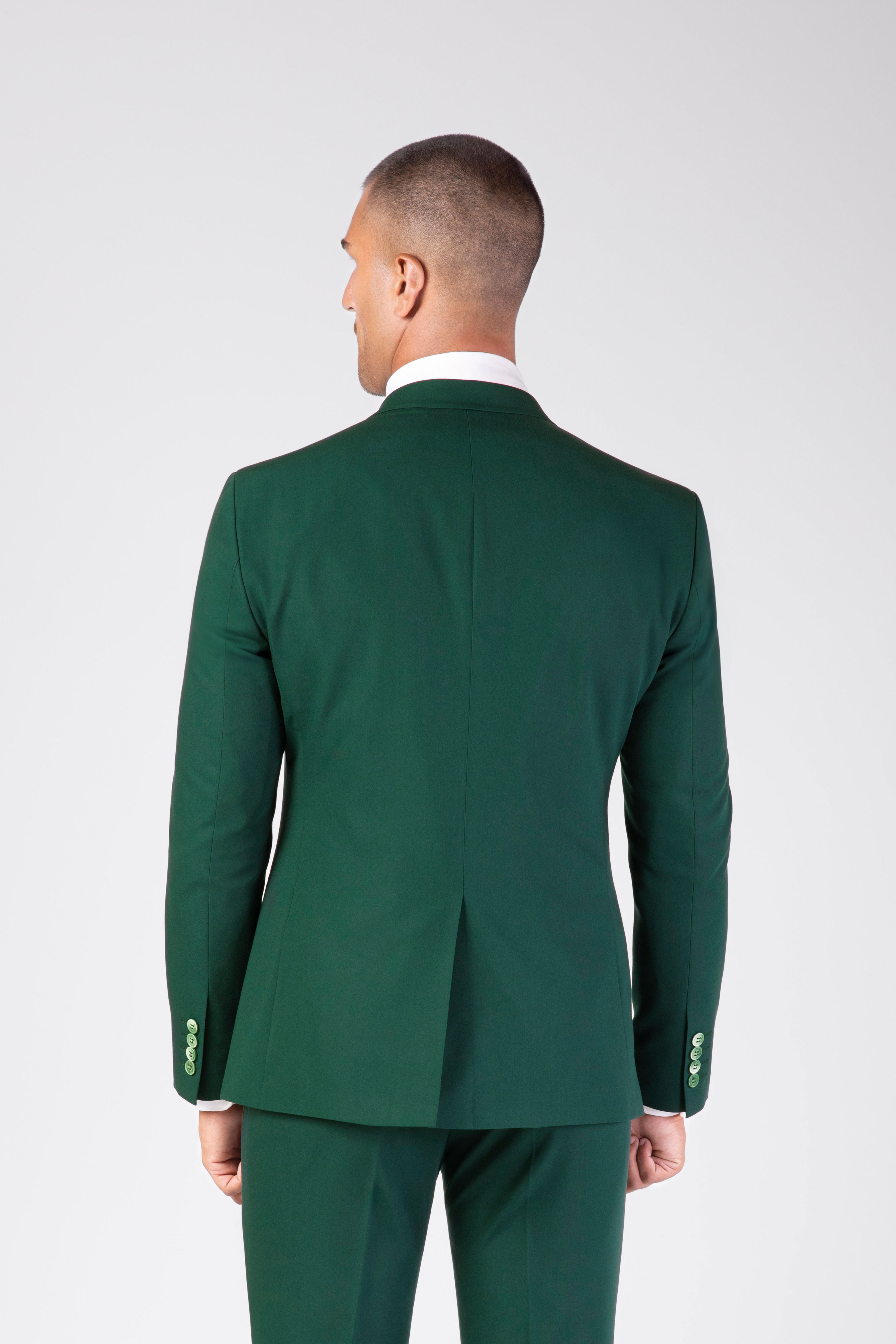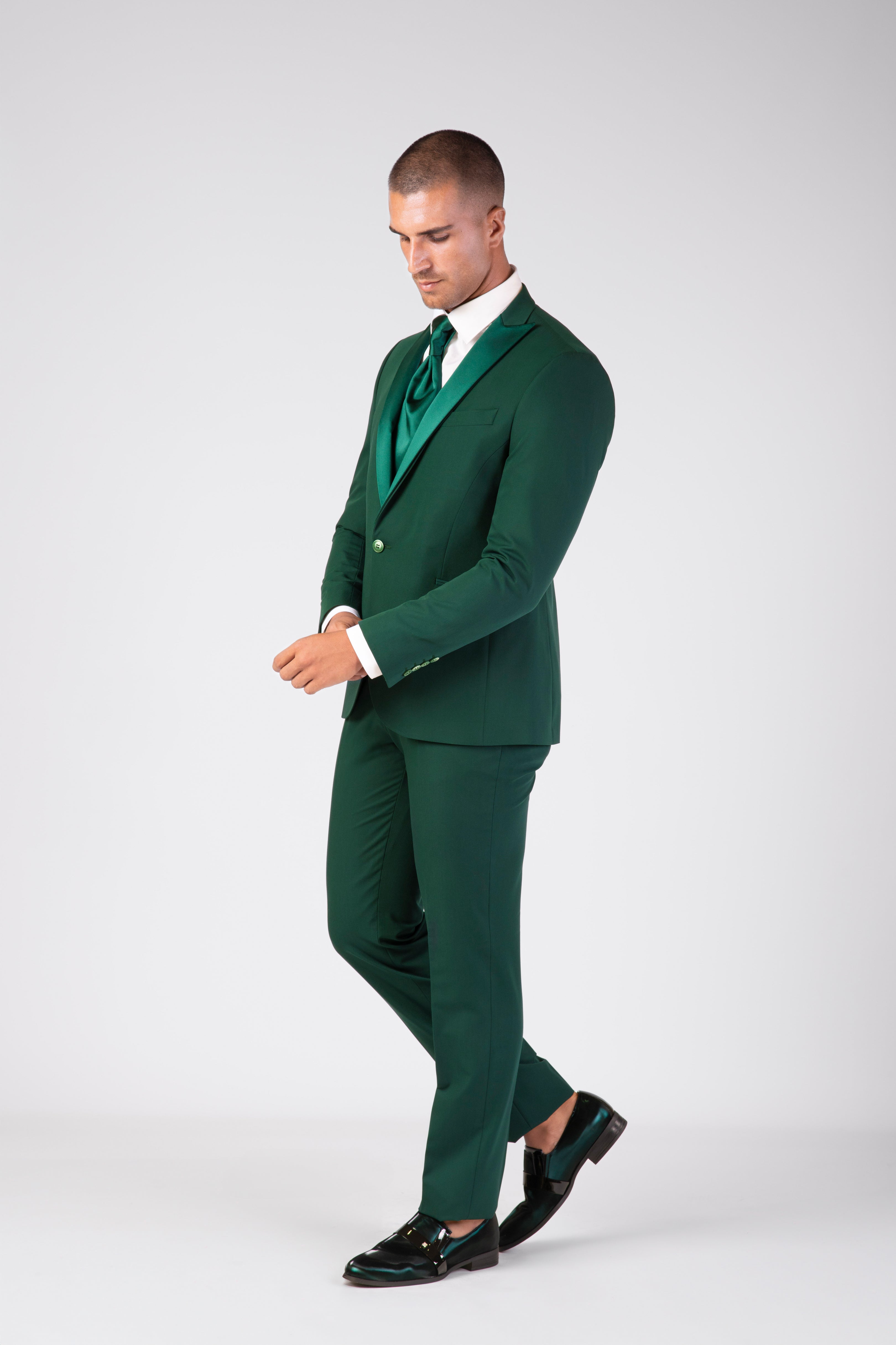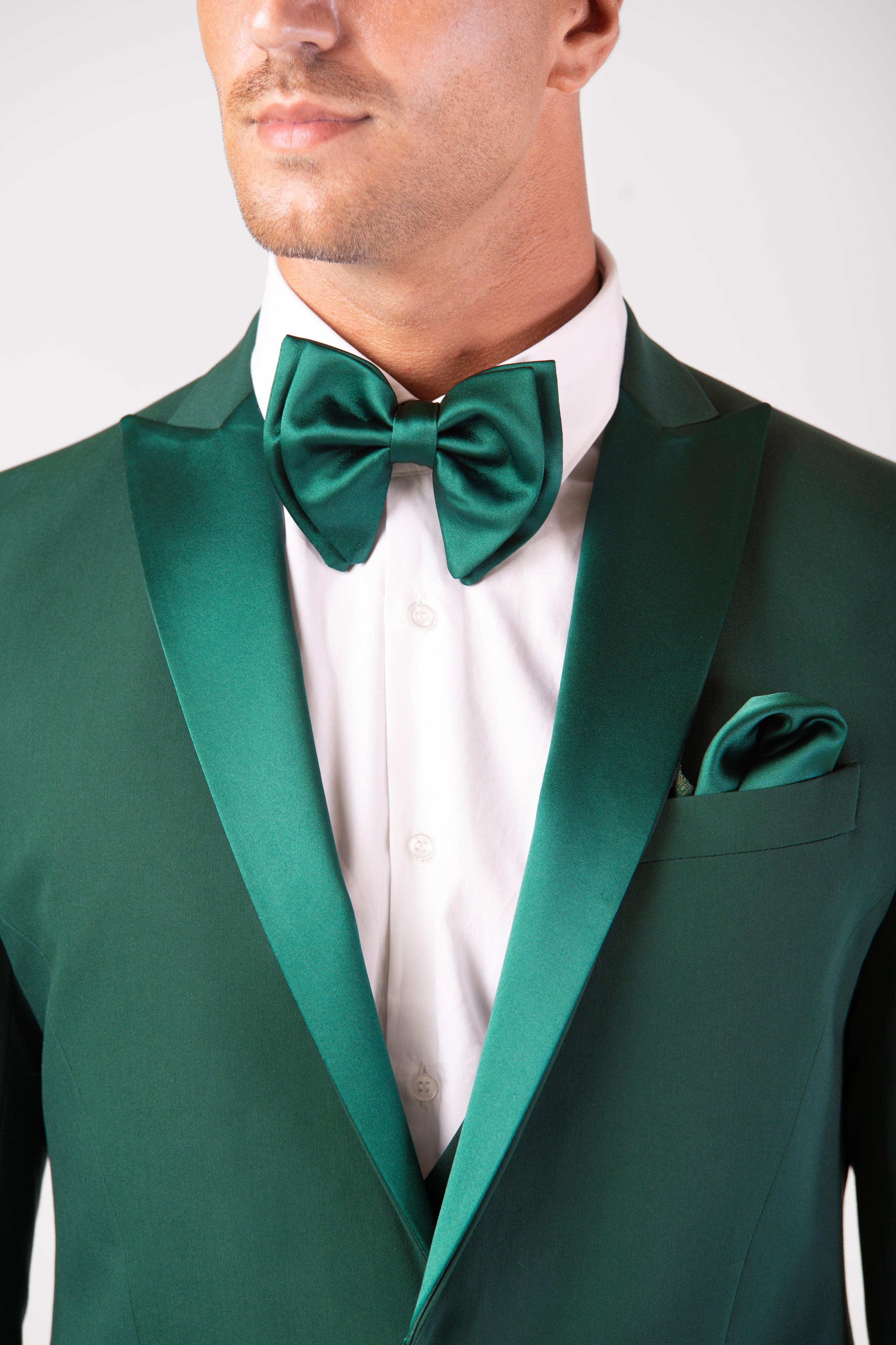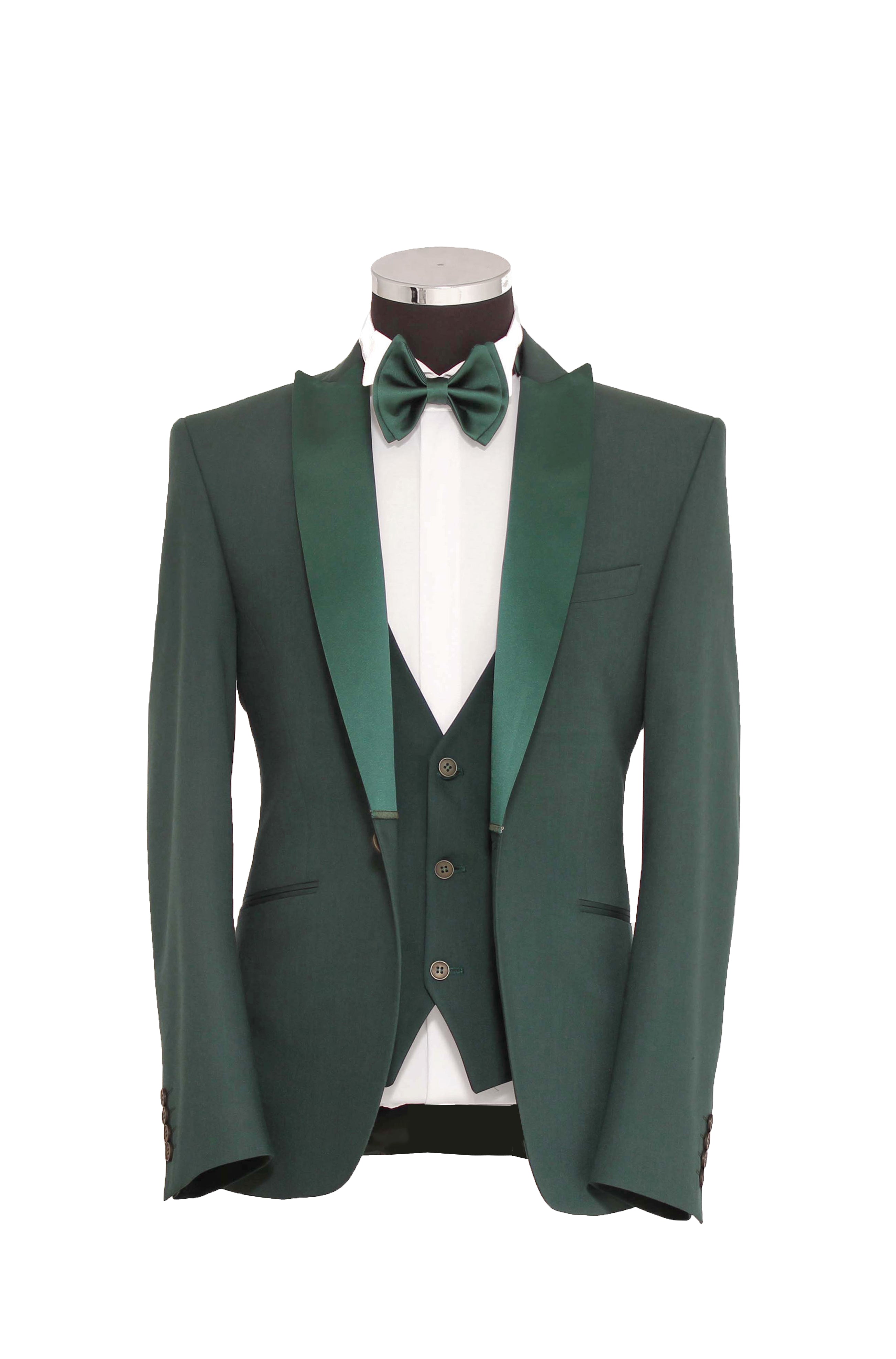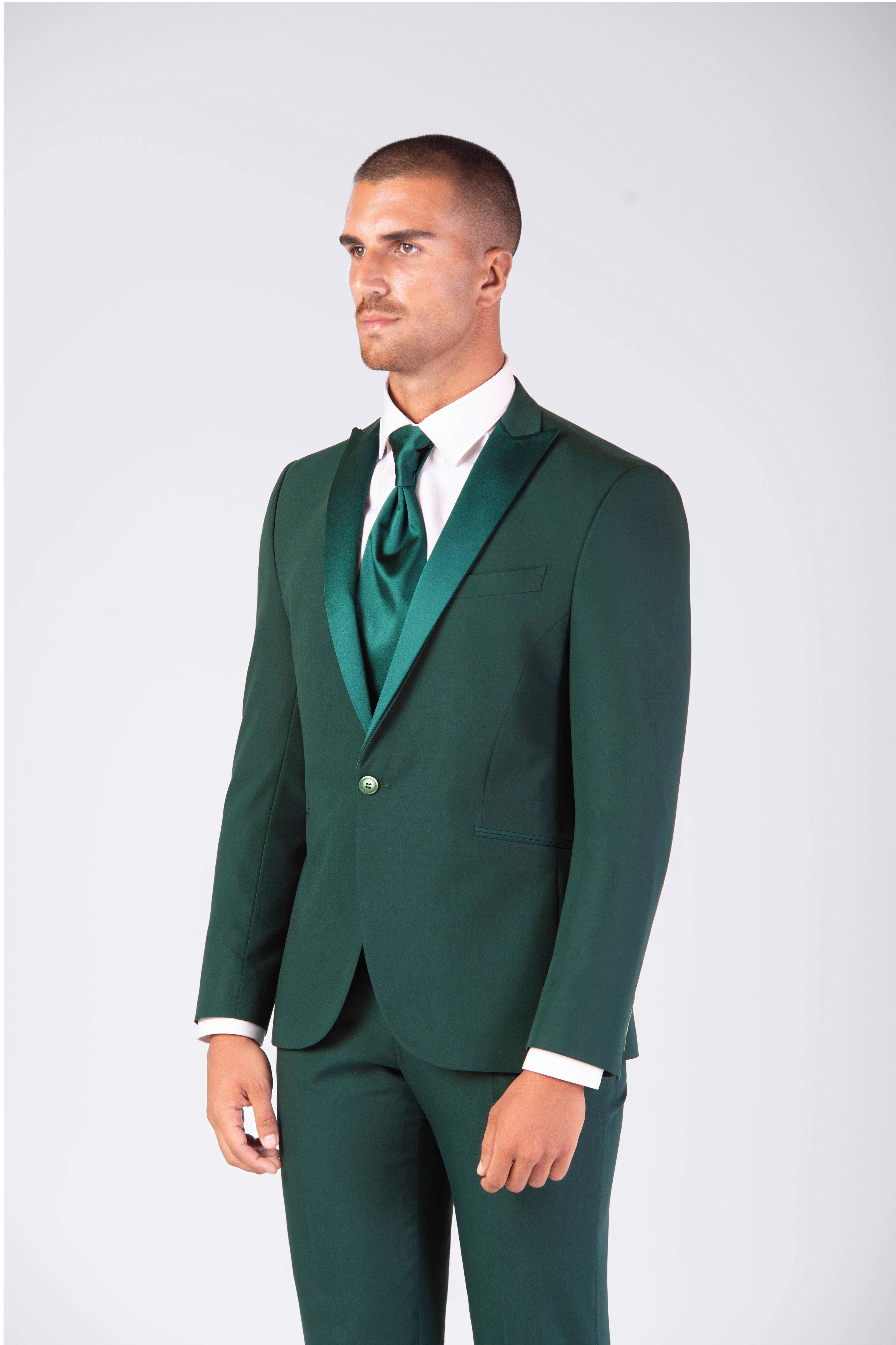 Smoking slim fit verde muschio con Collo a lancia e reverse in raso rimovibile.