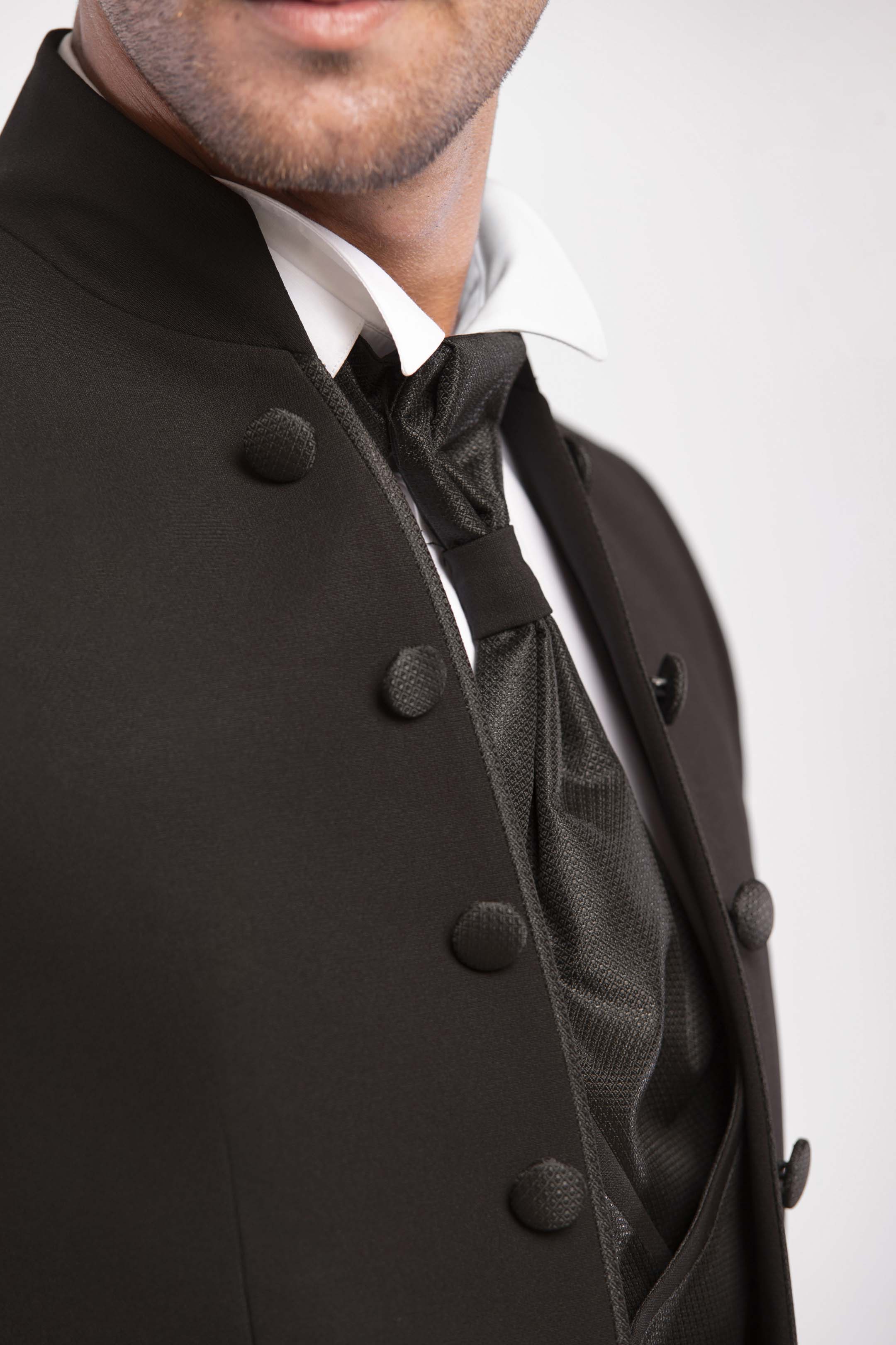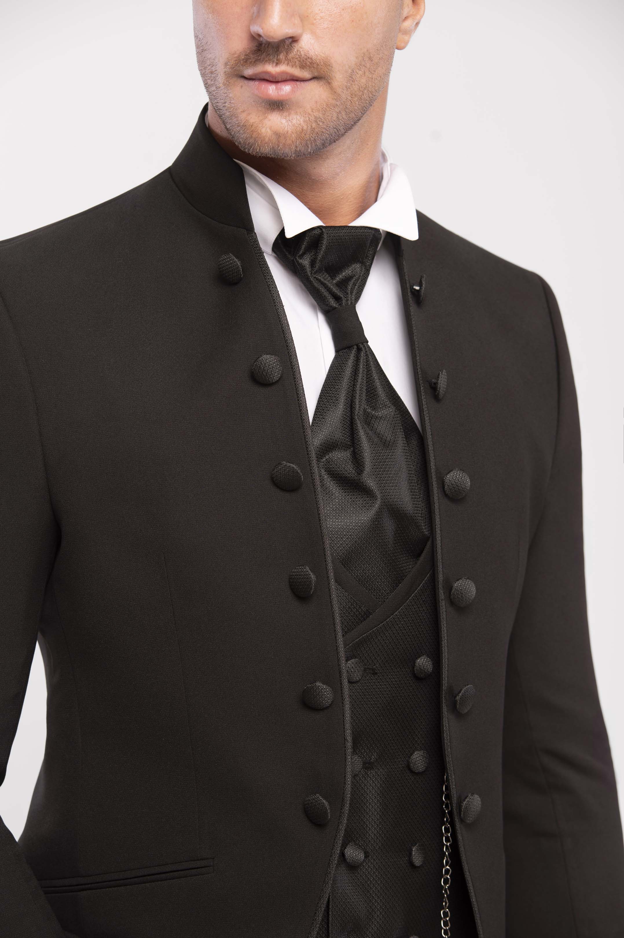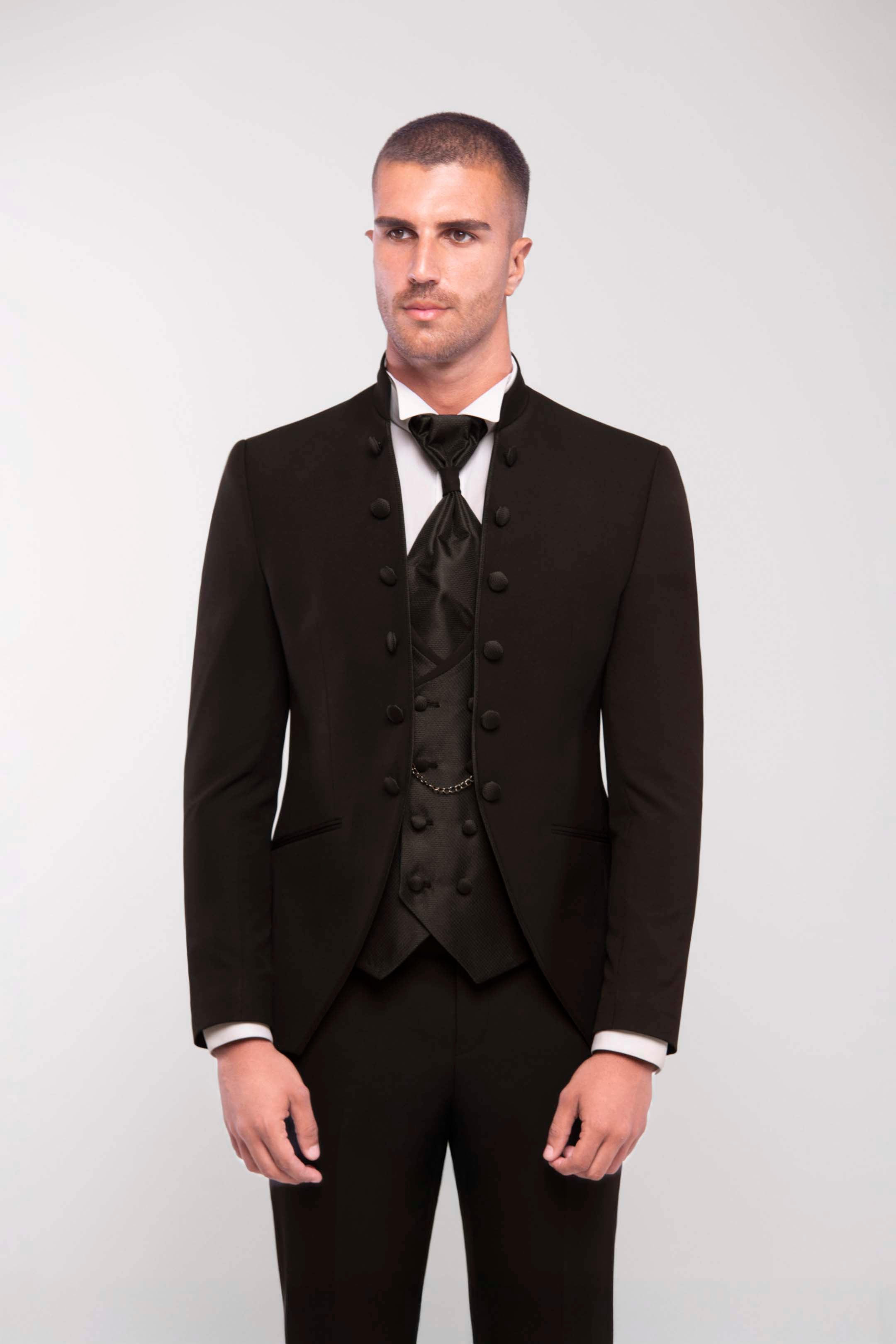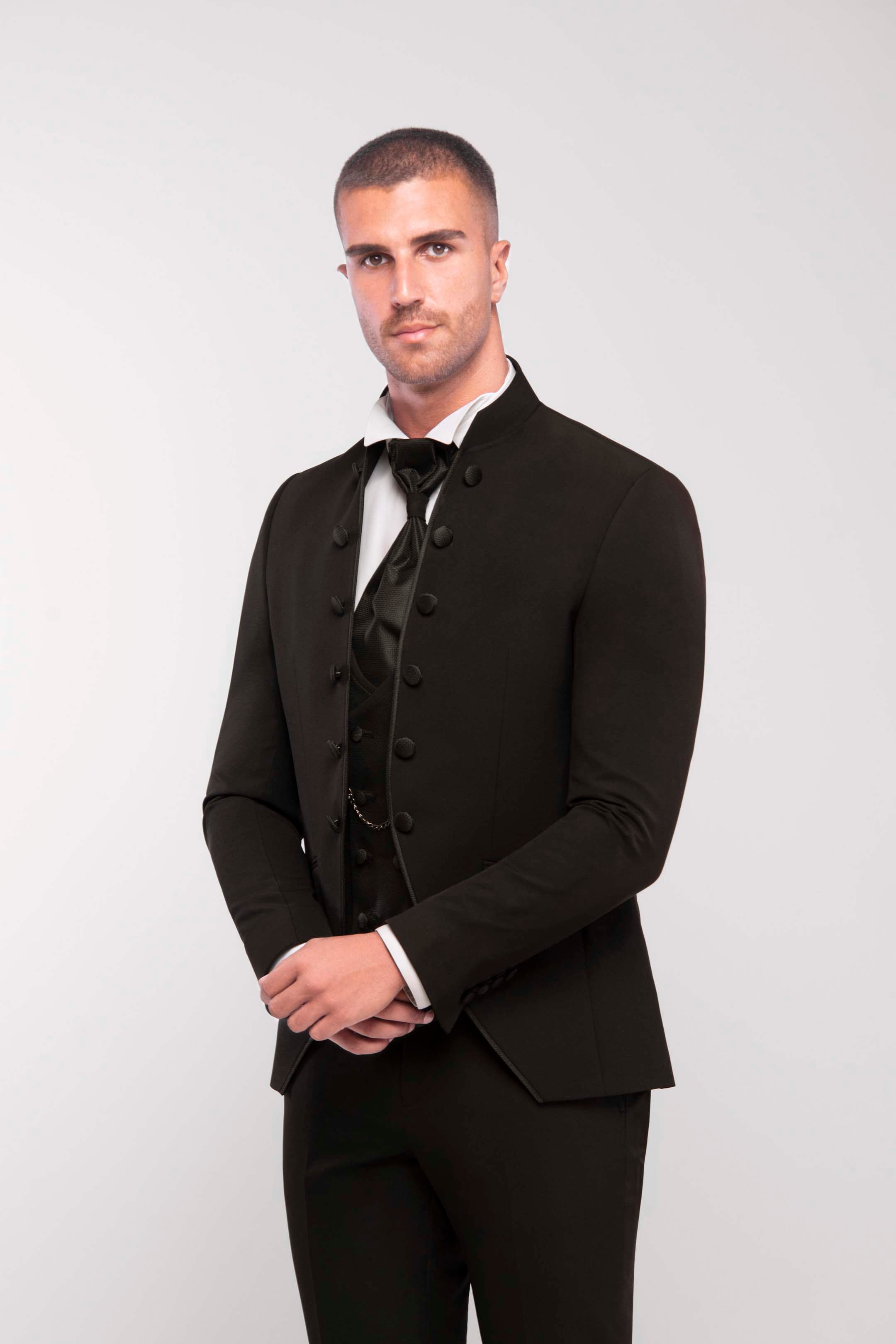 bito da sposo coreano total black con giacca a sei bottoni e chiusura ad alamaro. Gilet doppiopetto in tessuto micro lavorato coordinato con plastron e spilla Swarovski. Una linea essenziale che cattura lo sguardo, perfetta per uno sposo affascinante e misterioso.