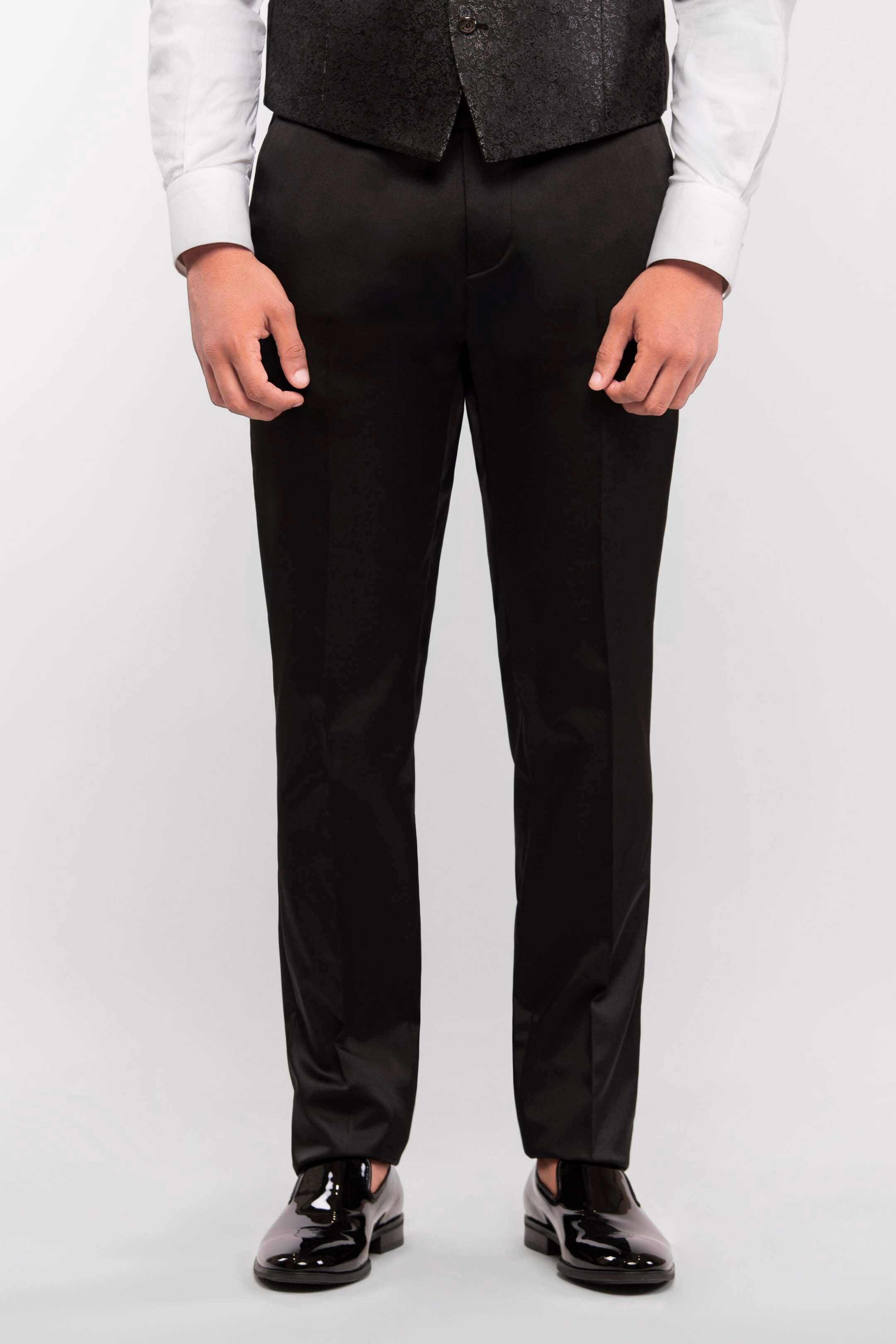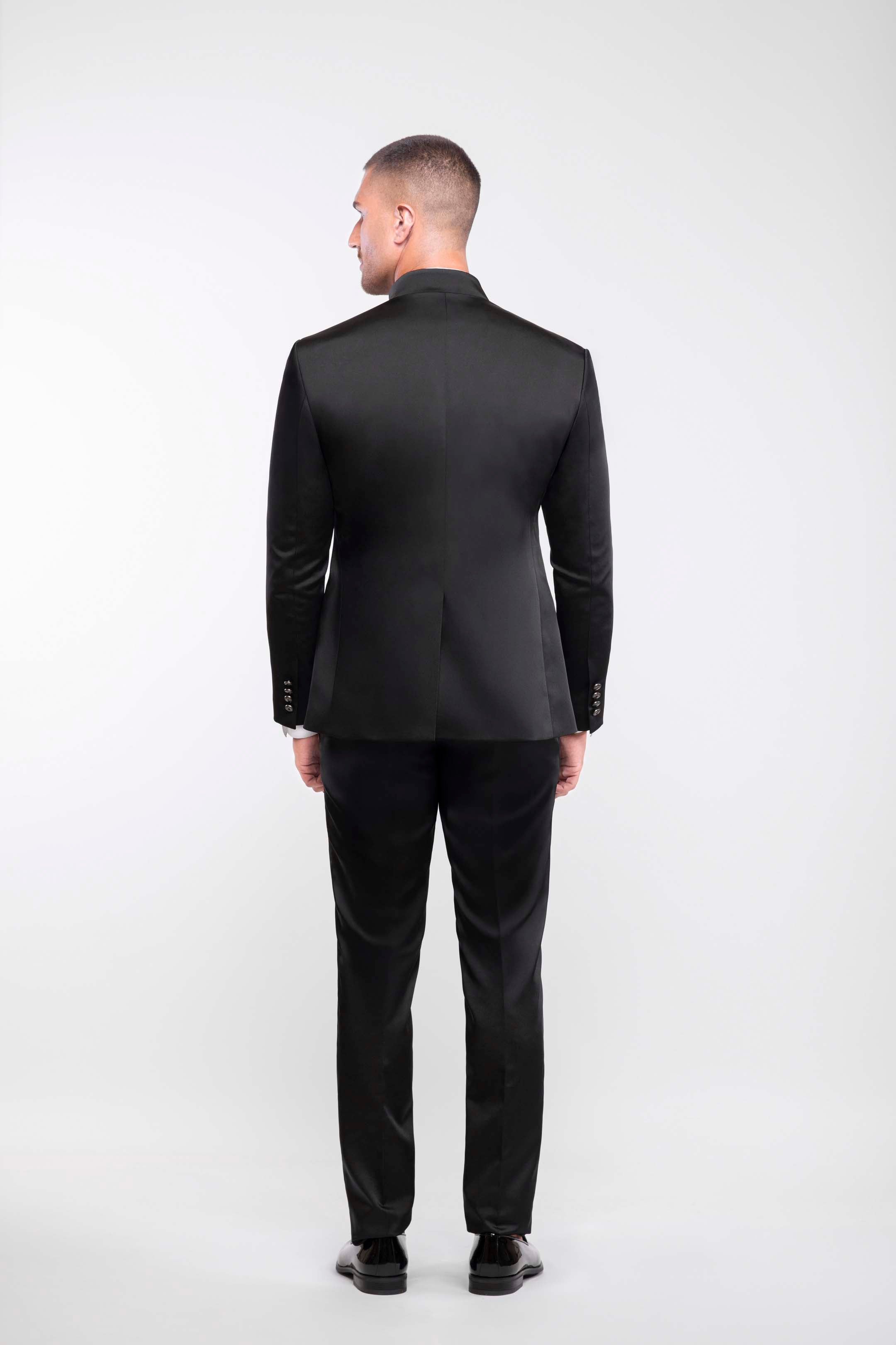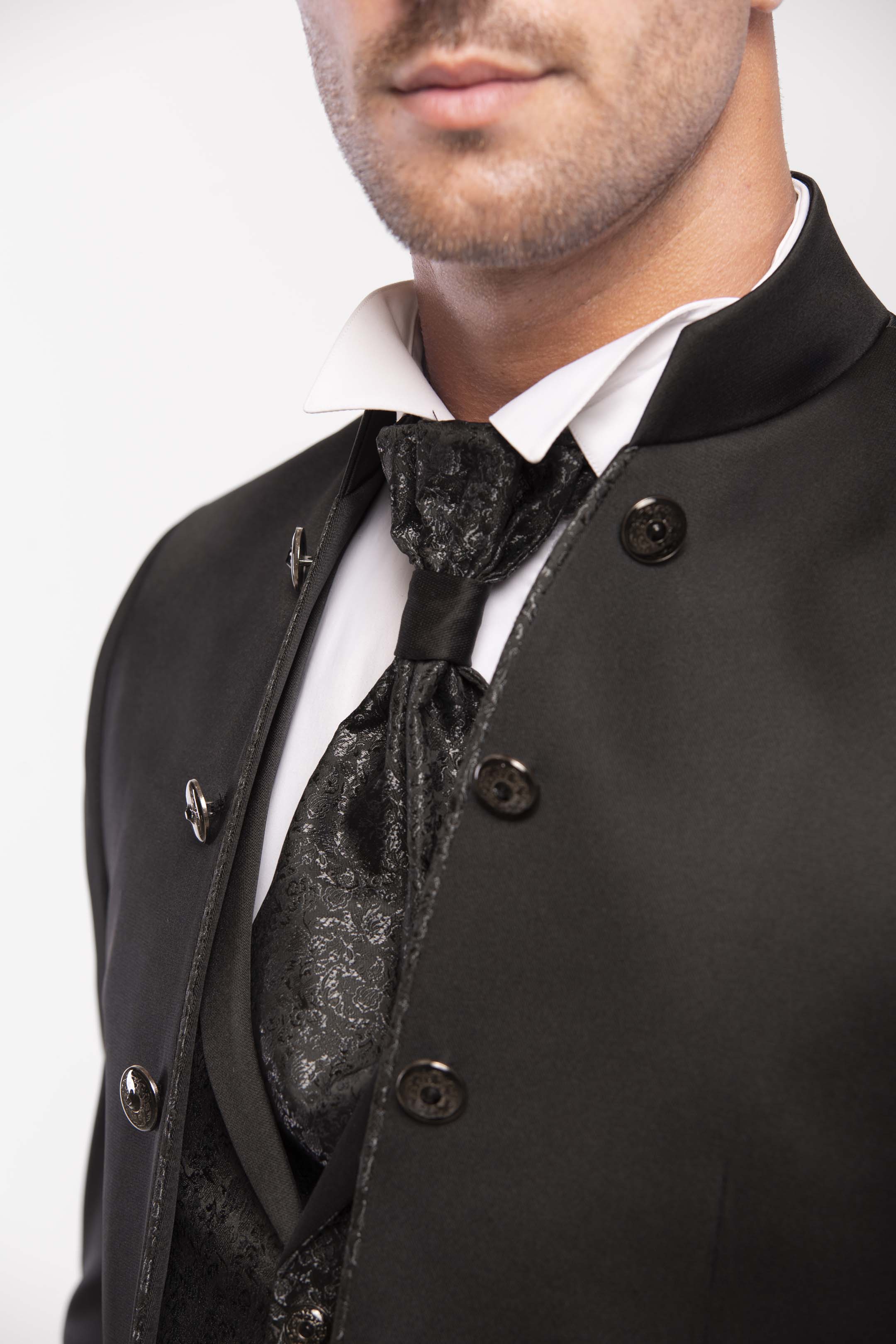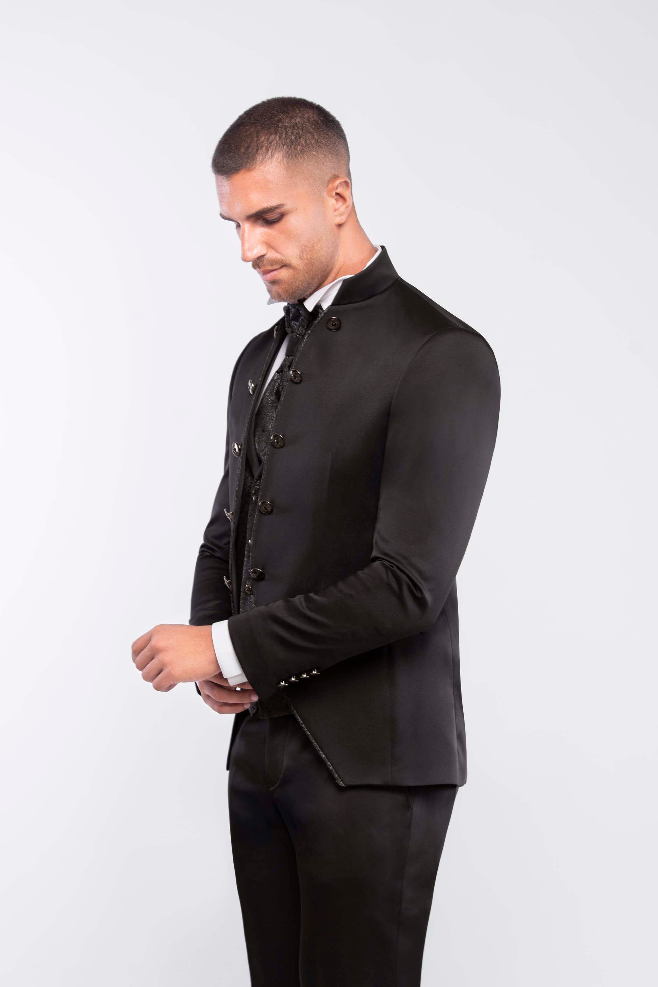 Abito da sposo coreano nero con chiusura ad alamaro e dettaglio di bottoni sul collo. La giacca è rifinita con bordura in broccato, abbinata a gilet e plastron coordinati, completati da una spilla Swarovski. Pantaloni slim per una linea elegante e definita, pensata per uno sposo dallo stile deciso e ricercato.
