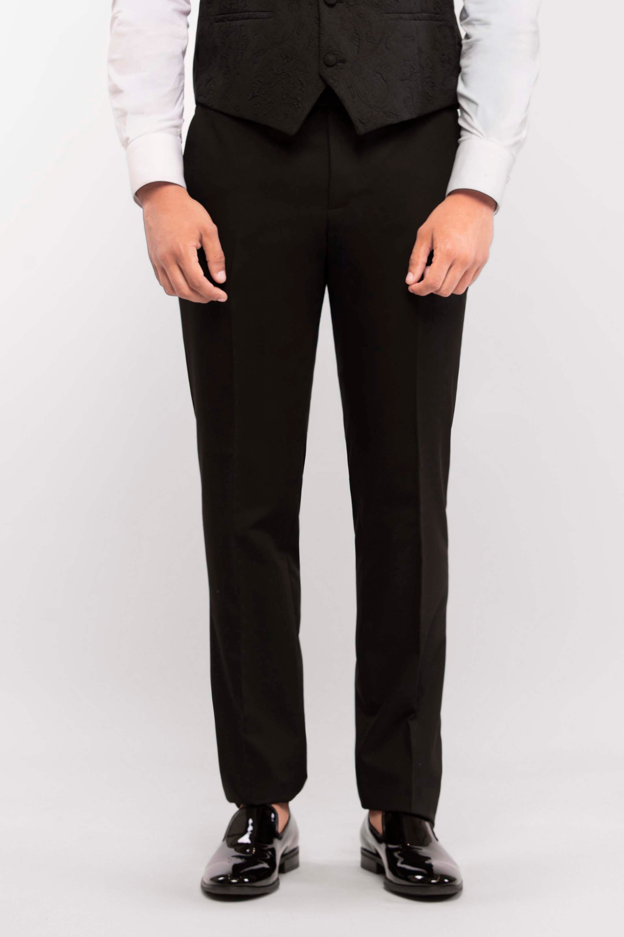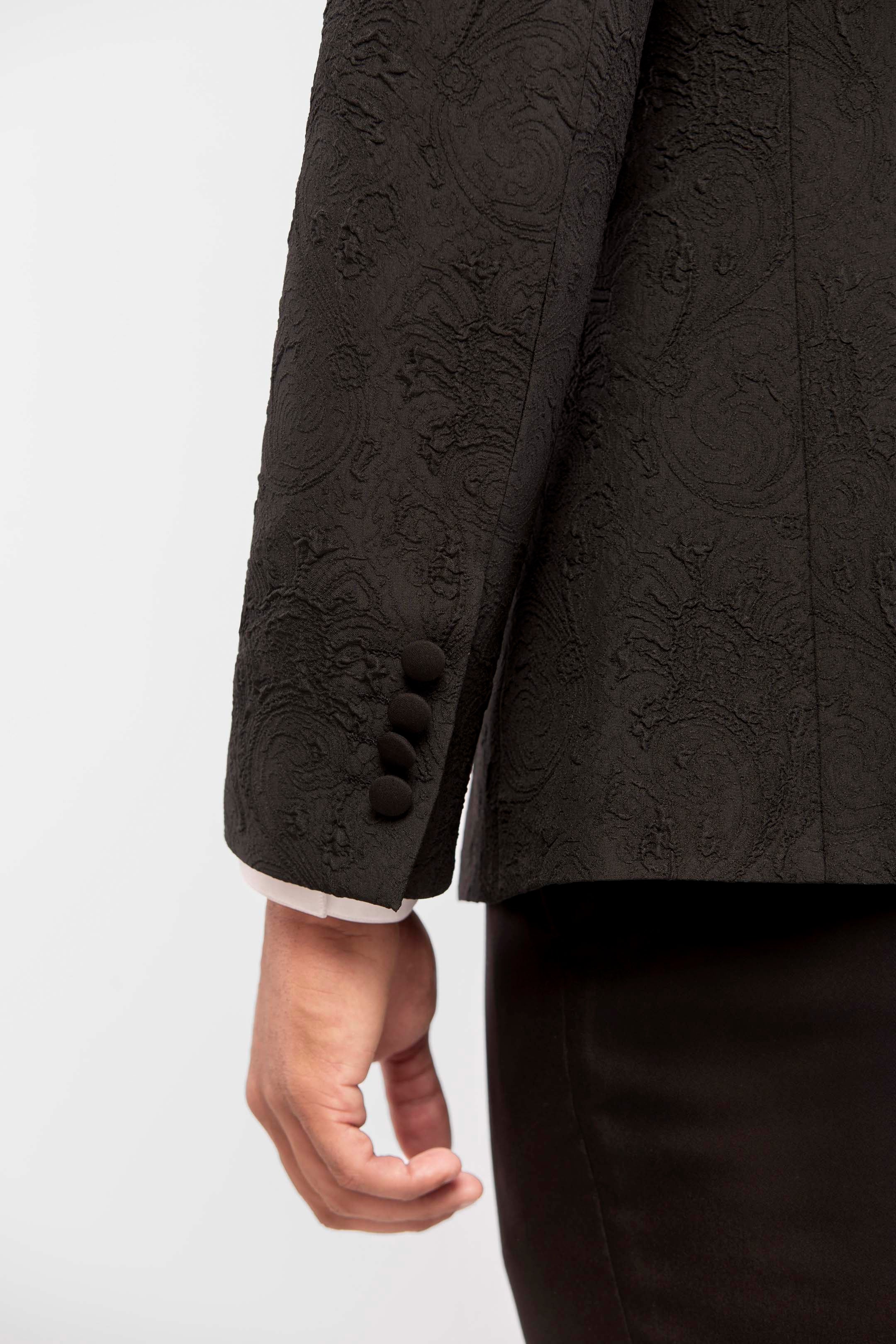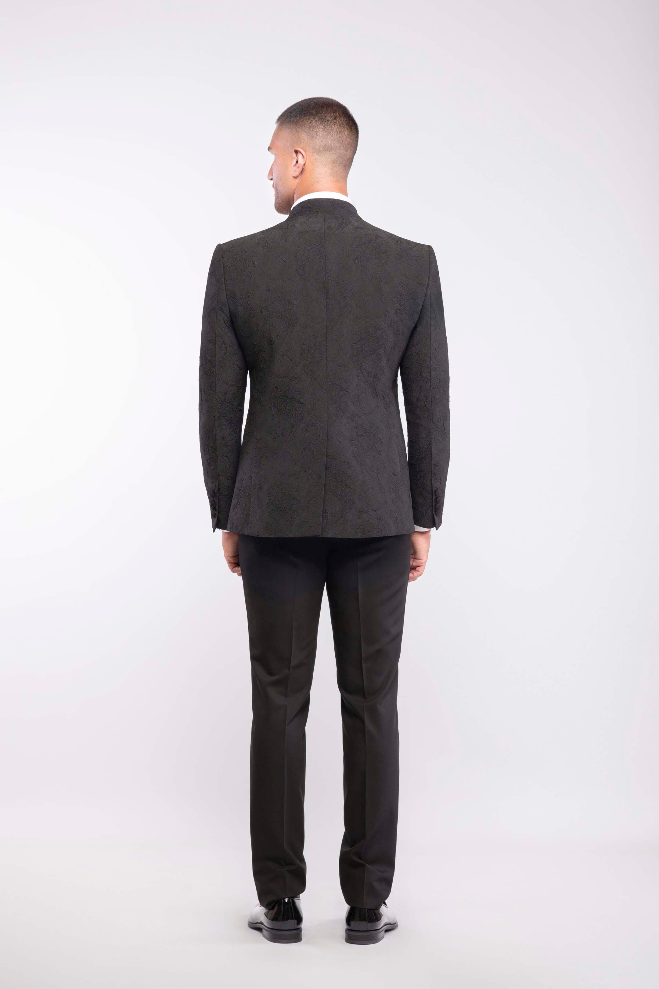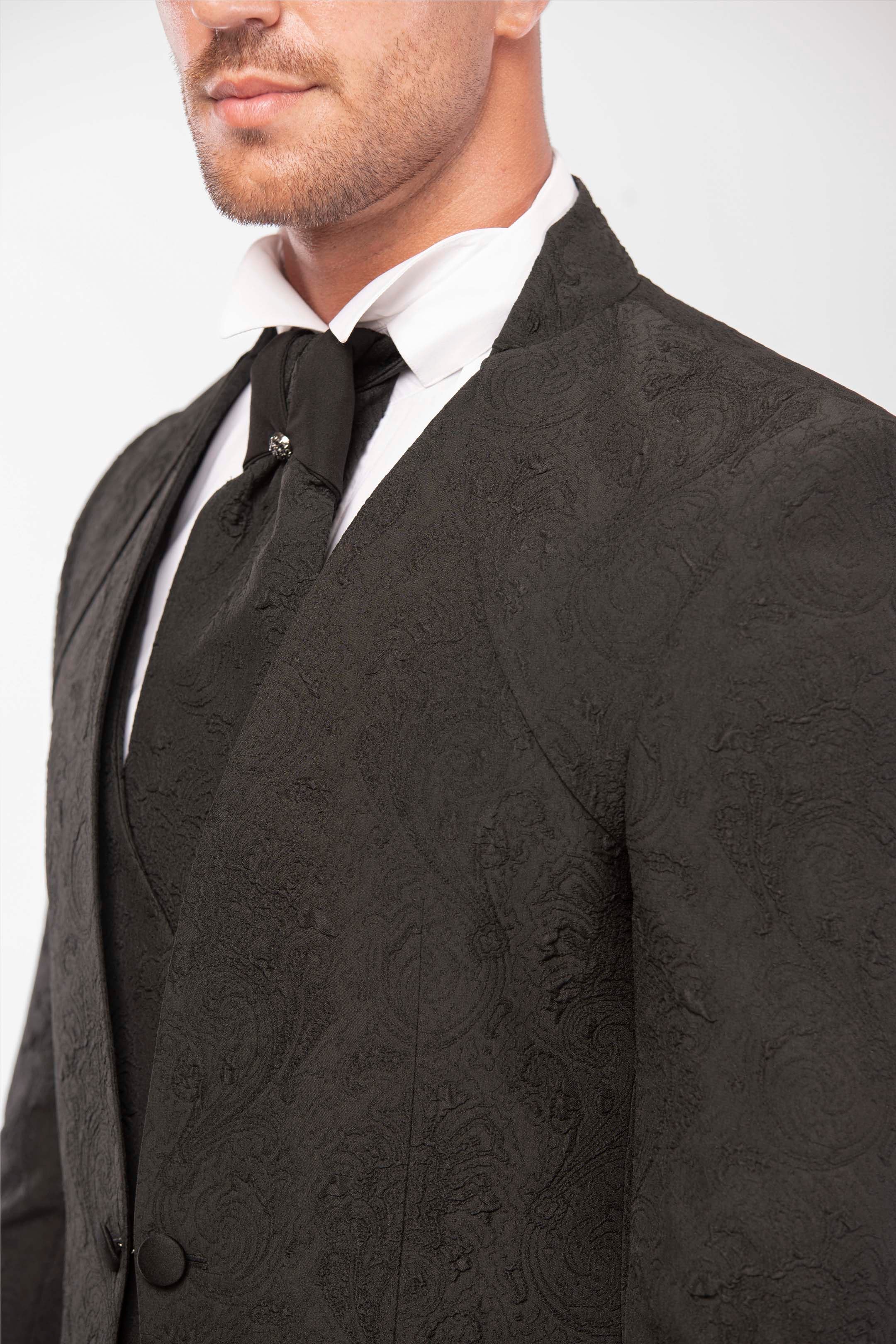 Abito da sposo coreano in tessuto damascato total black. La giacca slim fit, con sprone sulla spalla e alamaro a vista, unisce stile essenziale e carattere. Il gilet a quattro bottoni, il plastron con spillone e il pantalone asciutto completano un look minimal ma estremamente raffinato. Un ponte tra passato e presente, pensato per uno sposo dallo stile deciso.